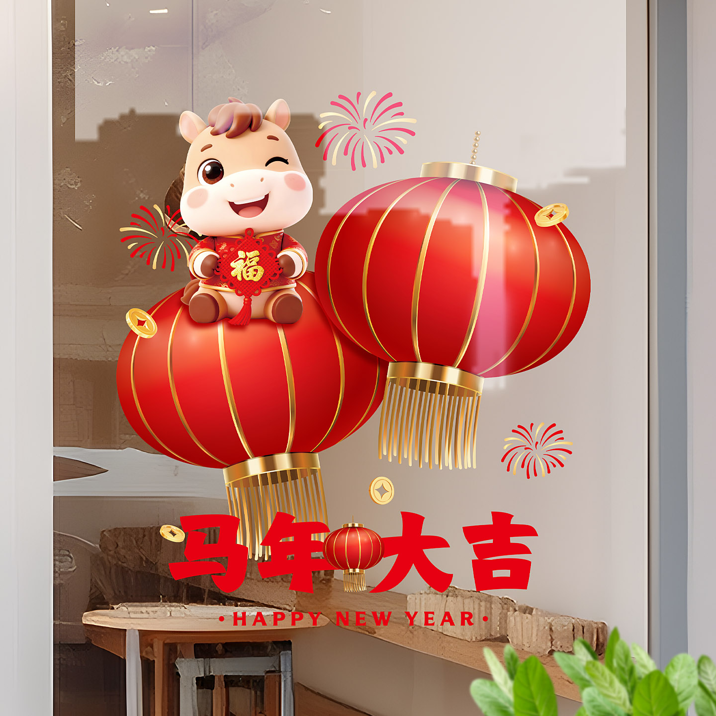 马年中式灯笼窗花静电贴画