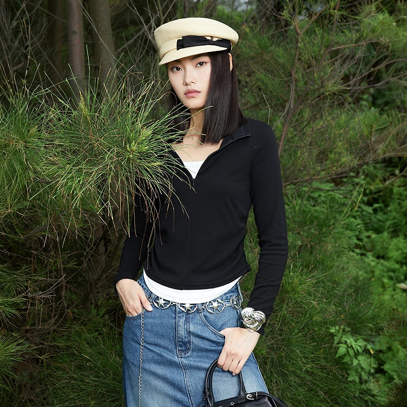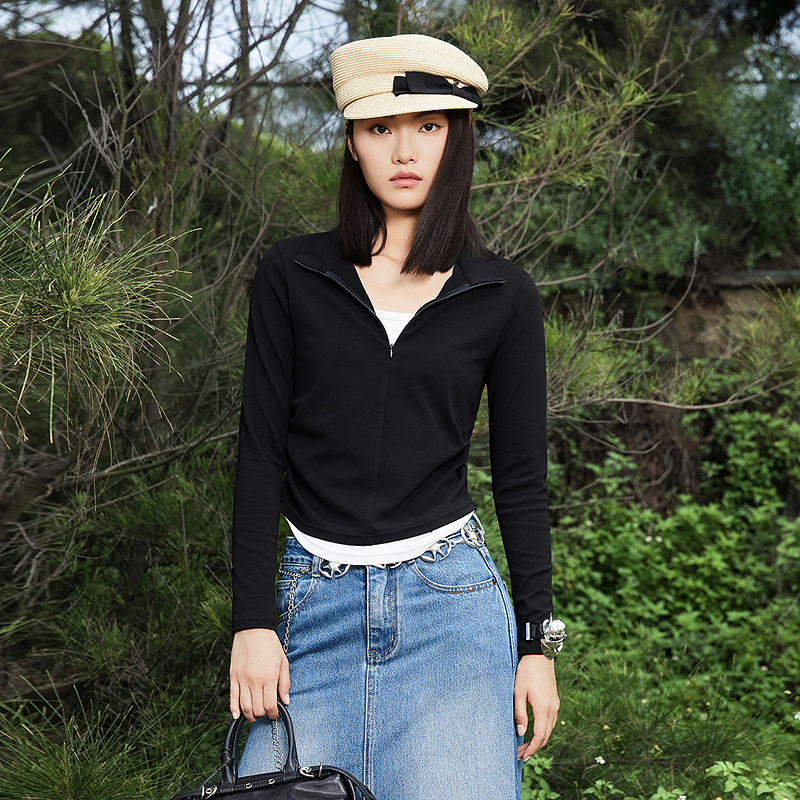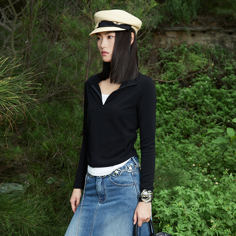 普普风2025年秋季新款商场同款撞色百搭拉链装饰假两件T恤女23132