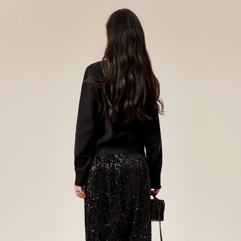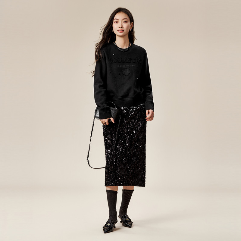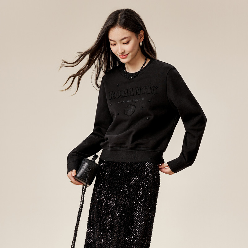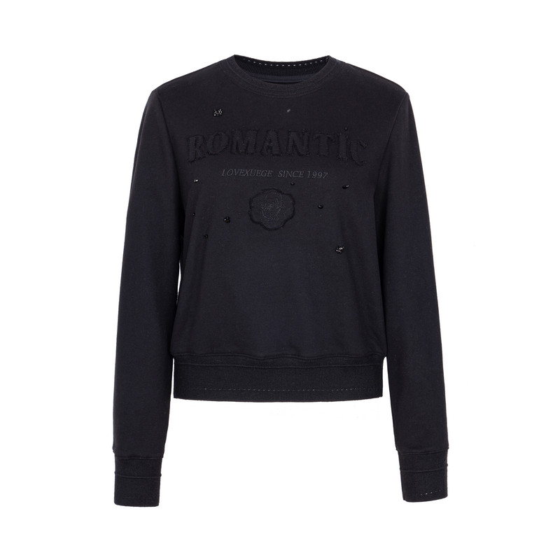 XG雪歌XK401540A890印花长袖套头卫衣时尚冬季新款黑色纯棉上衣女