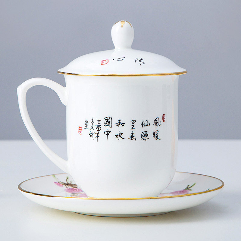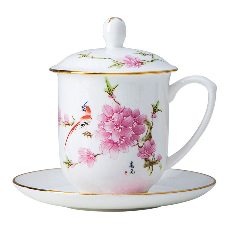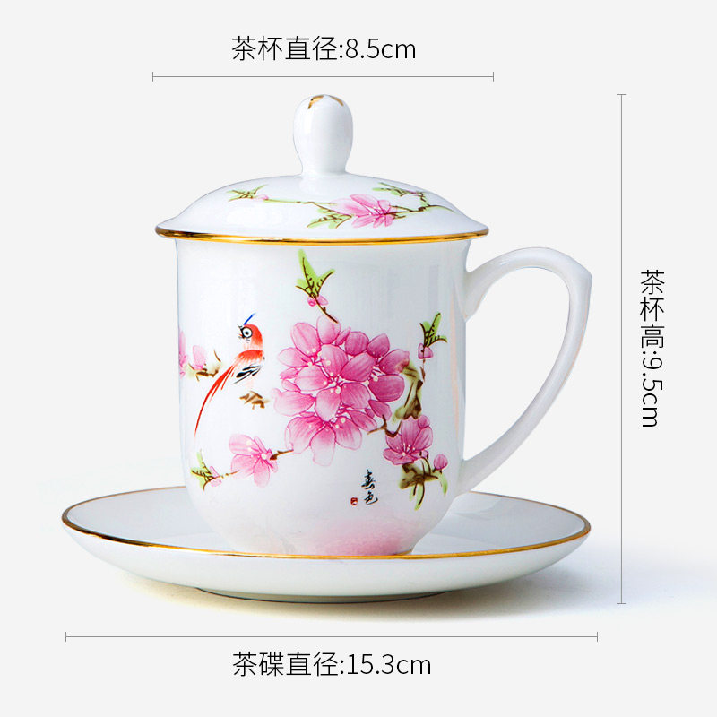 景德镇陶瓷手工描金水点桃花办公茶杯酒店会议杯骨瓷家用水杯带盖
