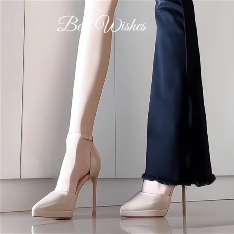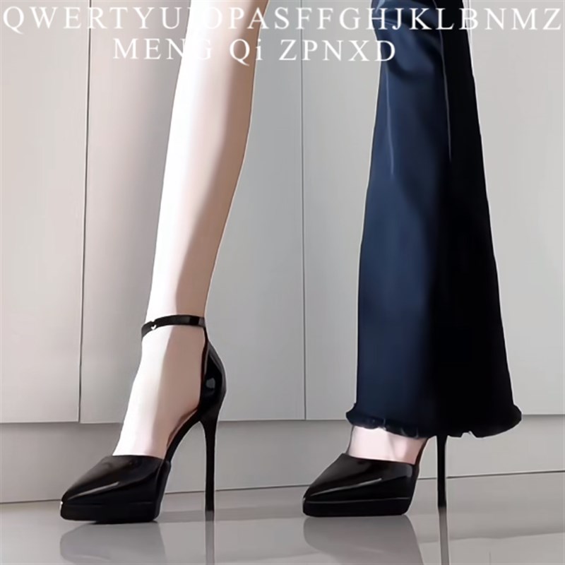 现货速发黑色防水台一字带高跟鞋细跟2024新款尖头裸色漆皮单鞋百