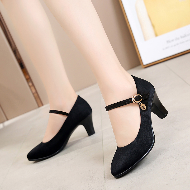 老北京布鞋夏天女鞋粗高跟鞋6厘米一字绑带黑色工作鞋女上班单鞋