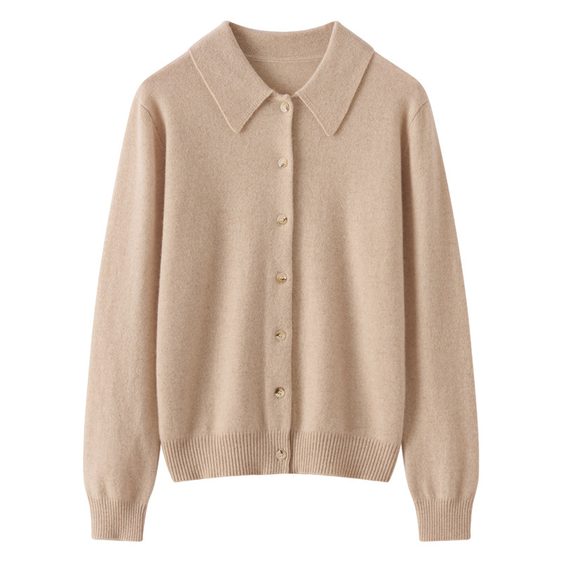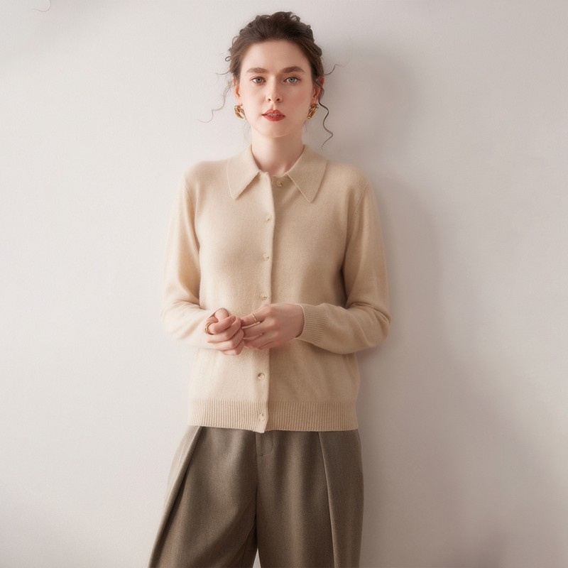 秋冬新款100%山羊绒开衫女Polo领衬衫宽松简约保暖针织打底衫外套