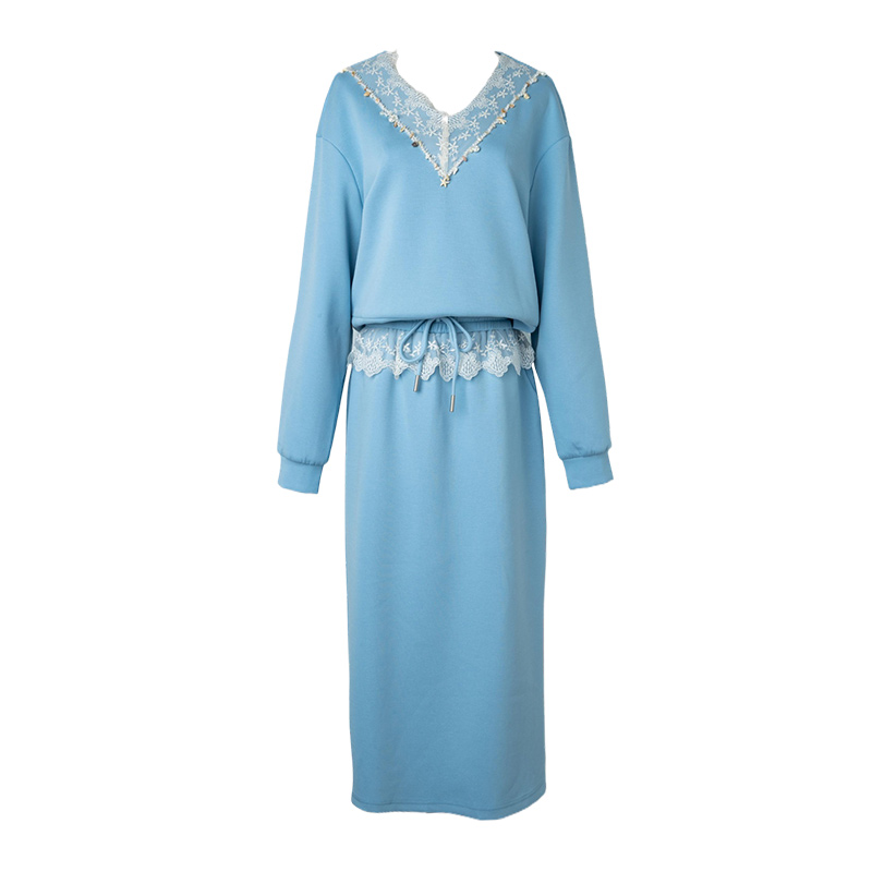 菲梦伊蕾丝边卫衣套装女秋季法式慵懒风时尚V领上衣半身裙两件套