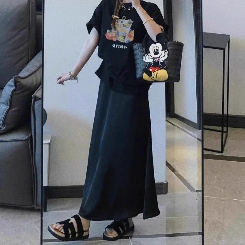 黑色缎面半身裙女夏季薄款大码胖mm梨形K身材高腰显瘦垂感a字裙子