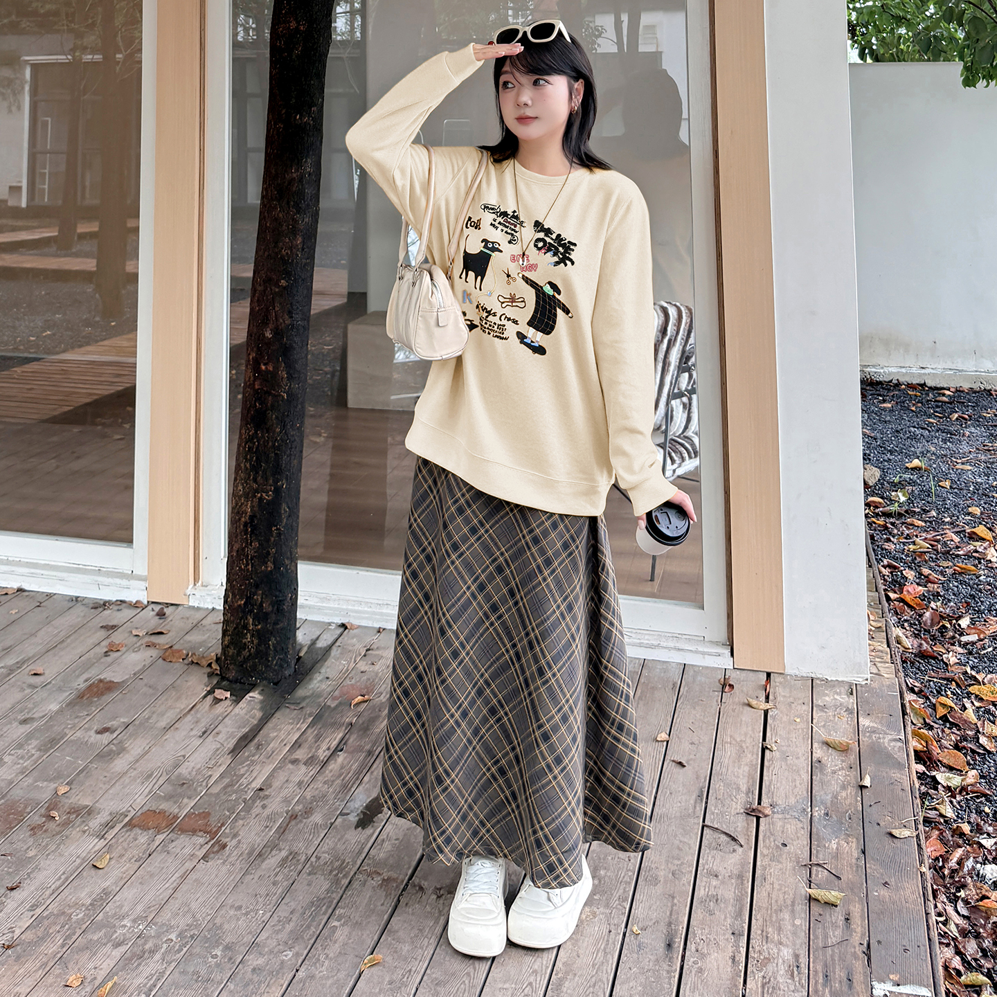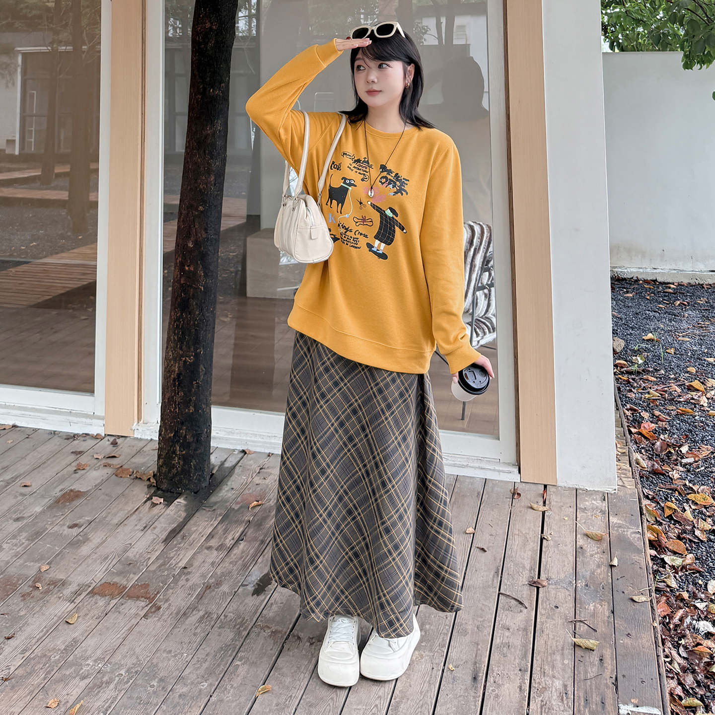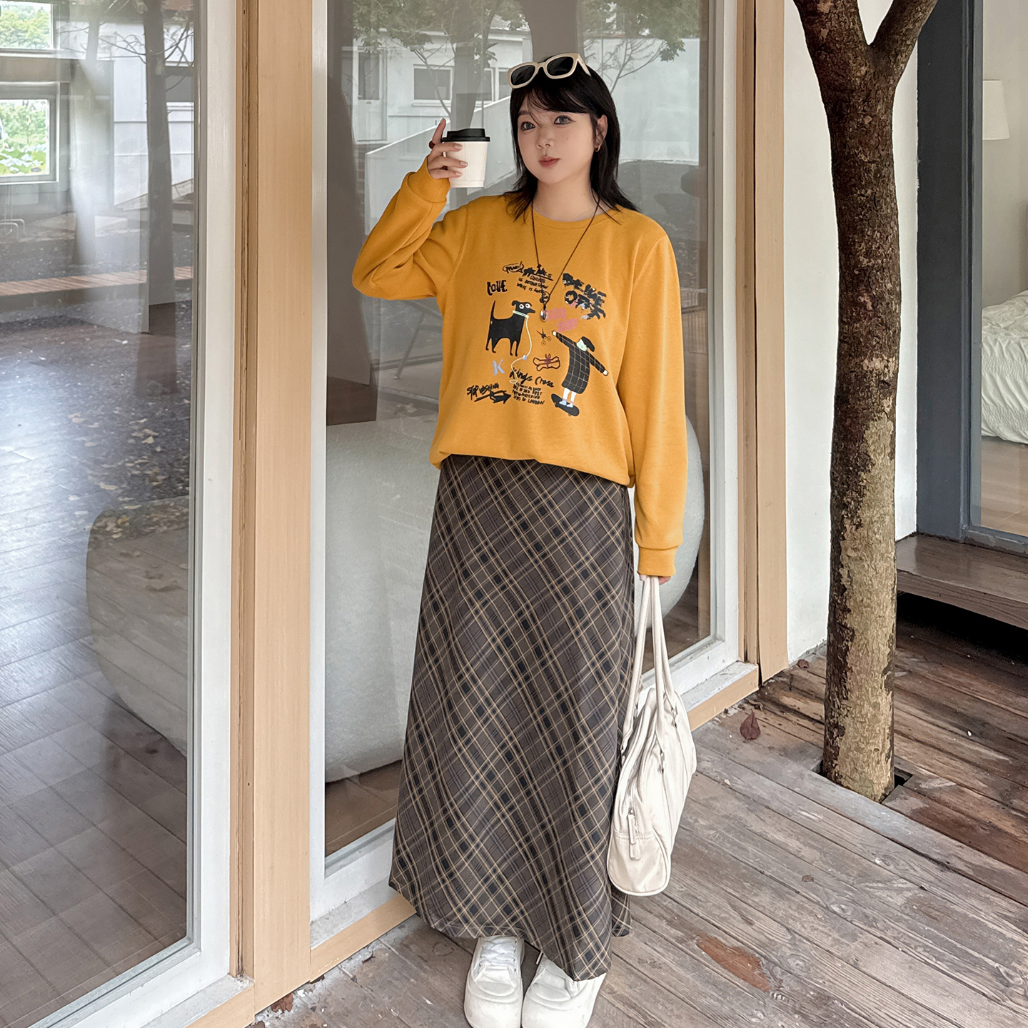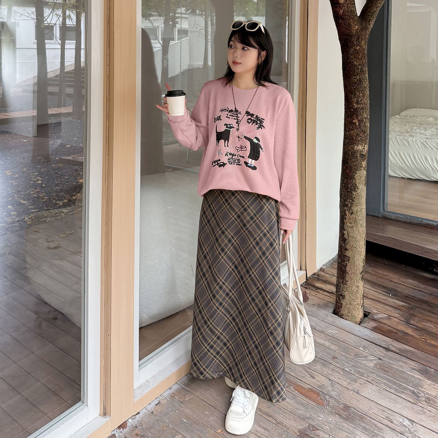 胖mm大码女装休闲套装2025秋季新款200斤印花卫衣格子半裙两件套