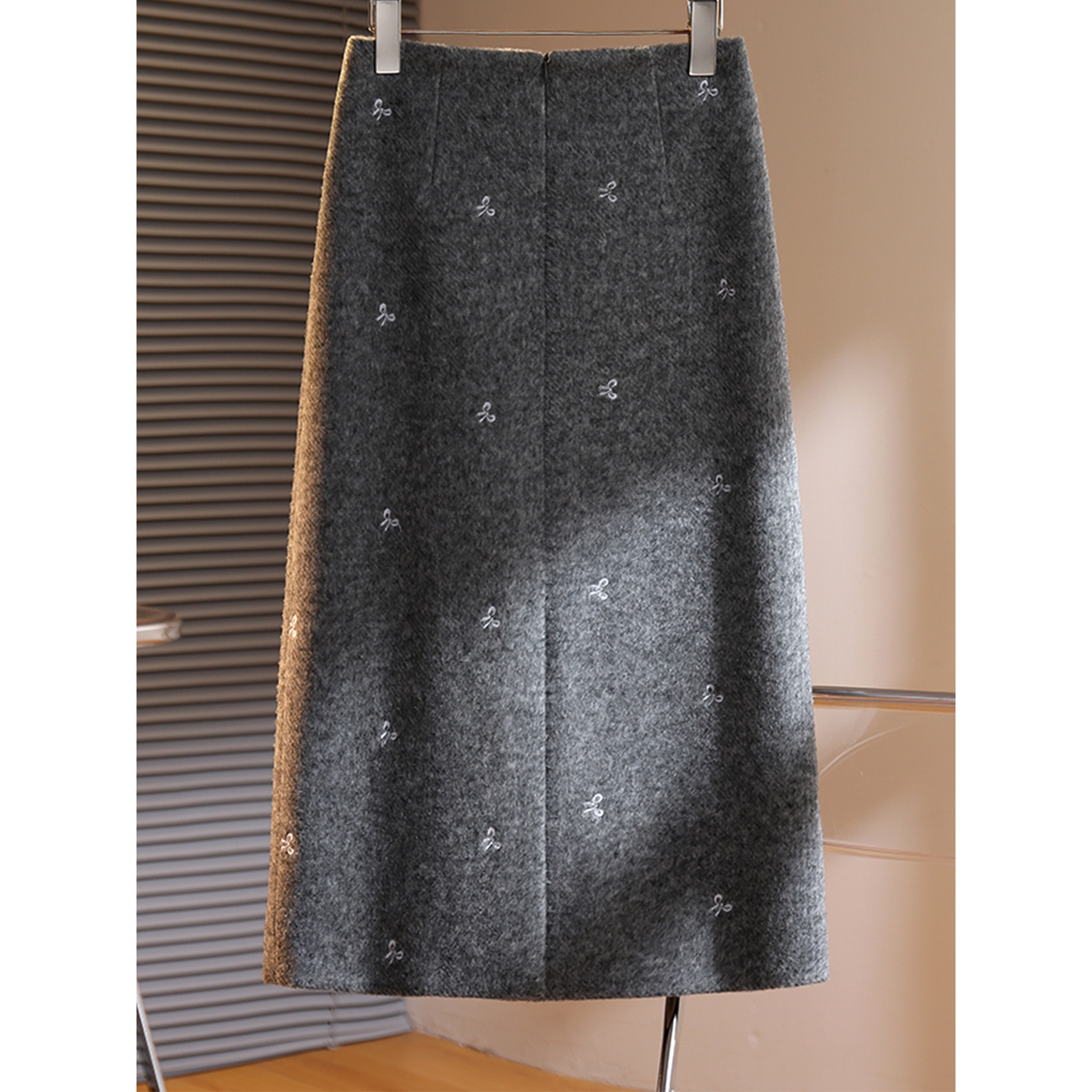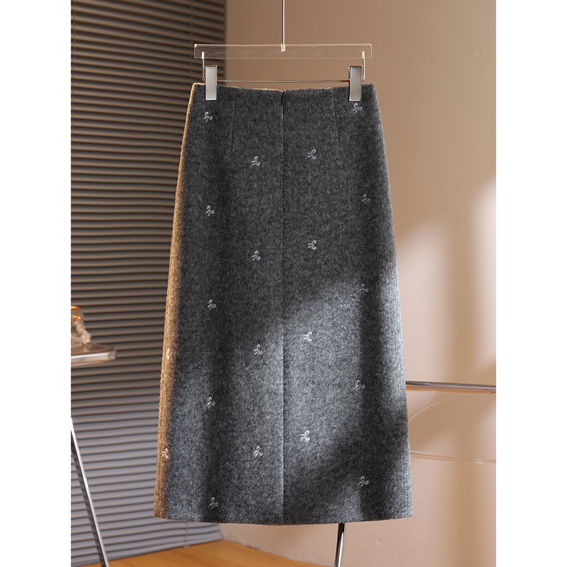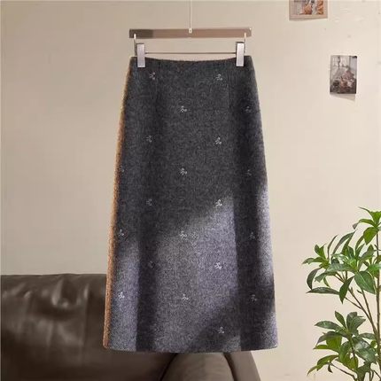 爵莱菲大码灰色羊毛半身裙女秋冬高腰开叉直筒裙刺绣中长款毛呢裙