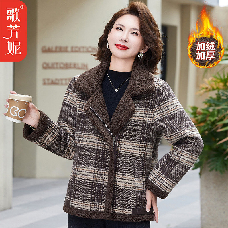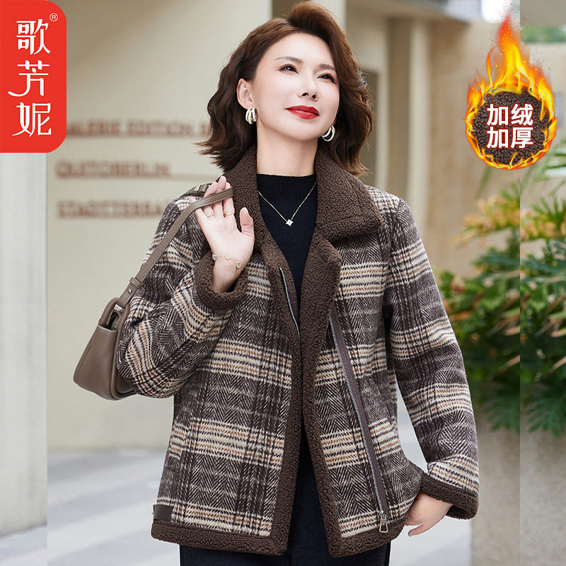 中老年女装格子加绒加厚毛呢子棉服中年妈妈秋冬装棉衣颗粒绒外套