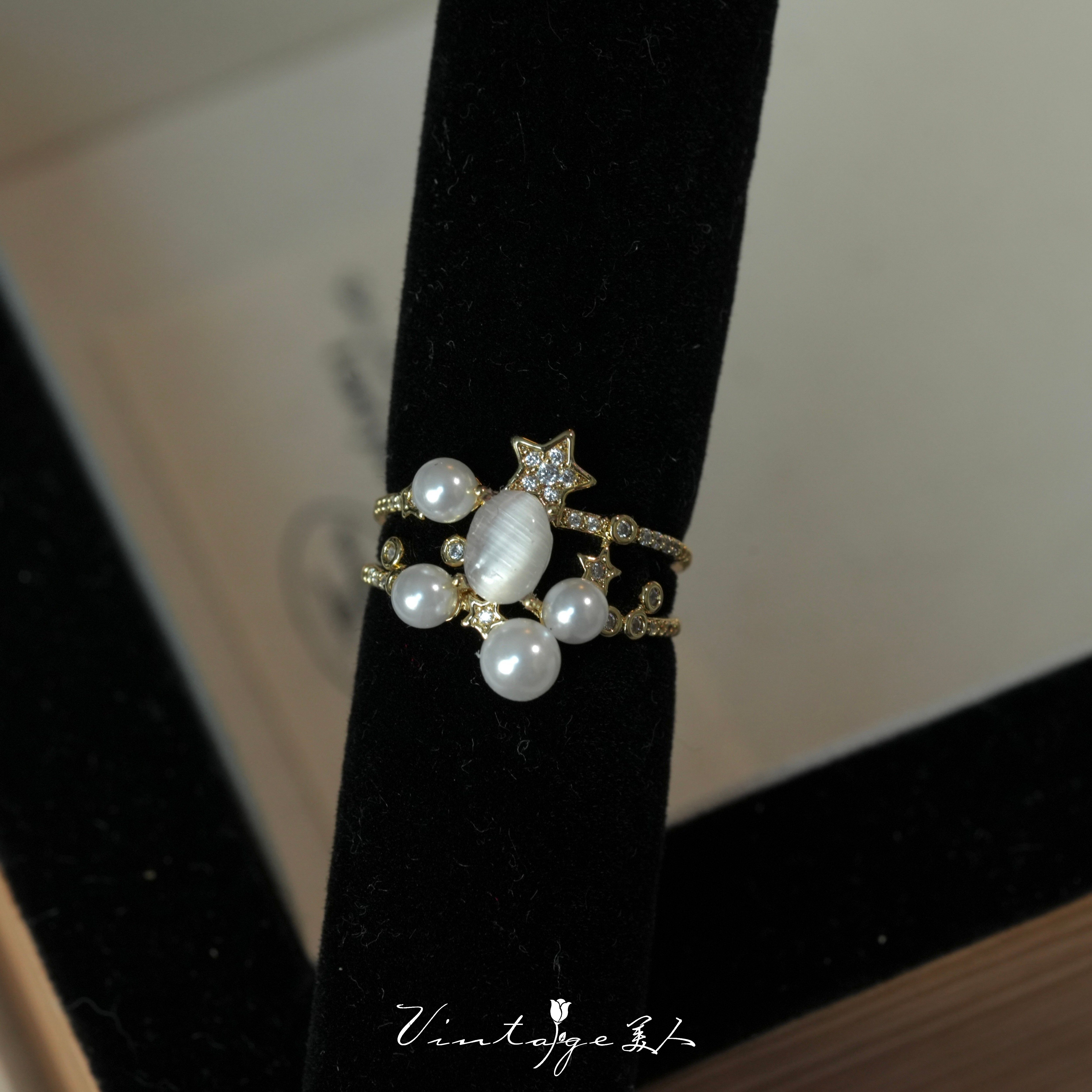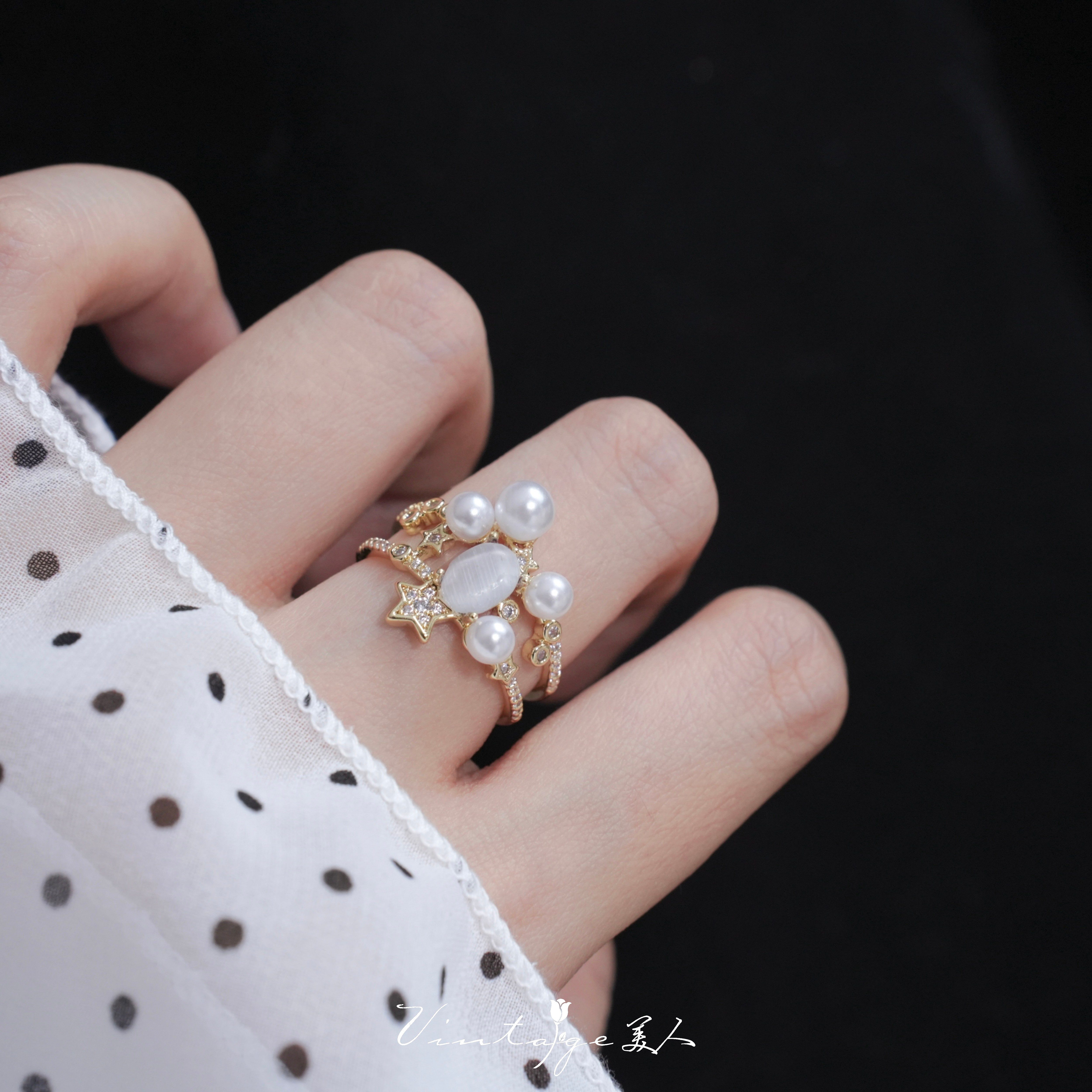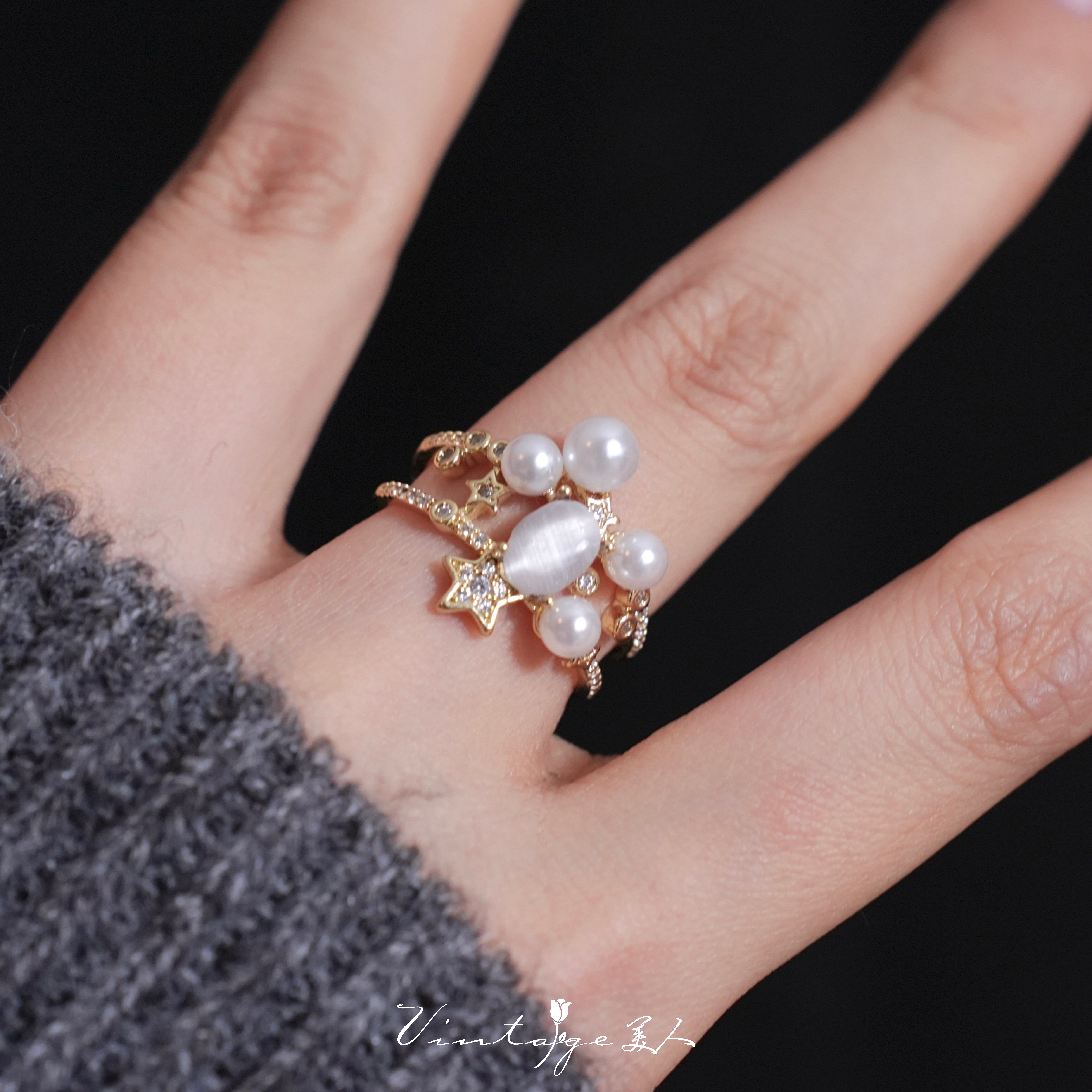 「繁星」法式浪漫高级感设计精致闪耀温柔多层珍珠猫眼石开口戒指