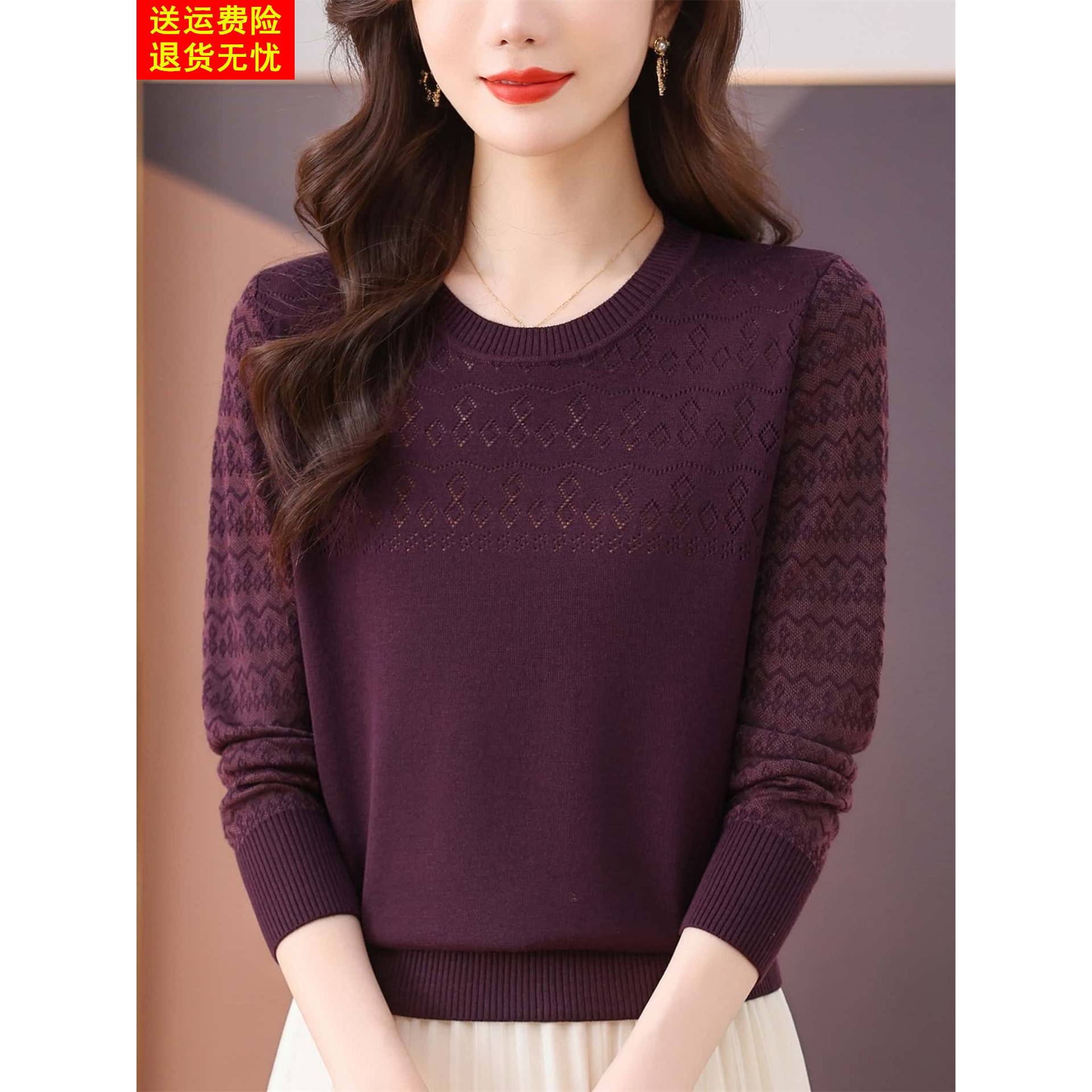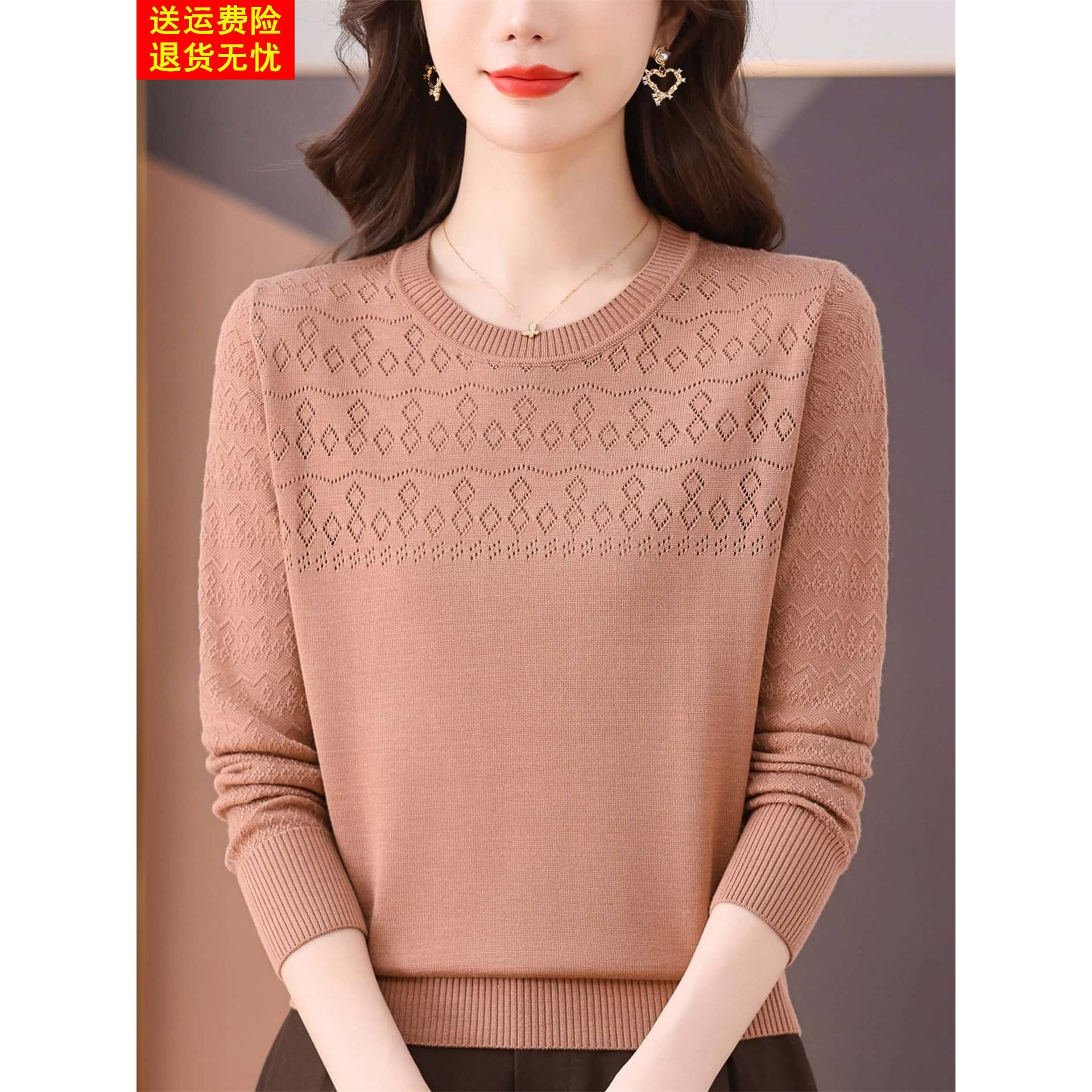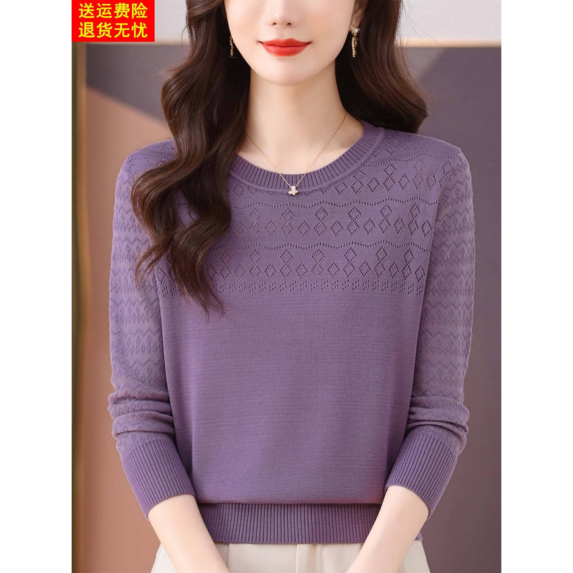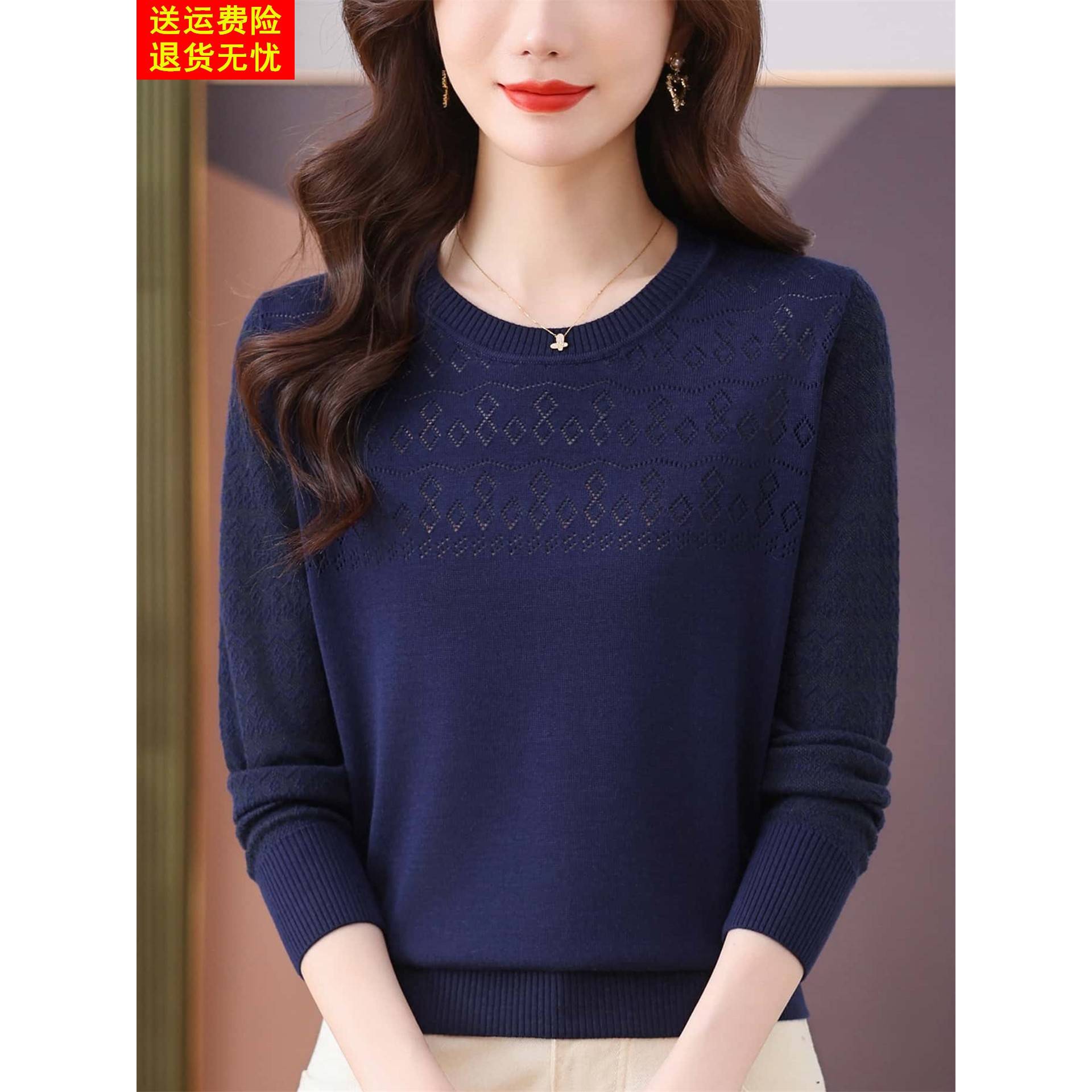 妈妈早秋桑蚕丝长袖t恤宽松蓝色针织打底洋气内搭显瘦小衫上衣女