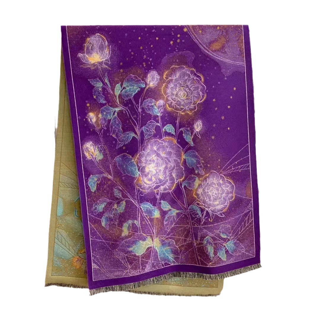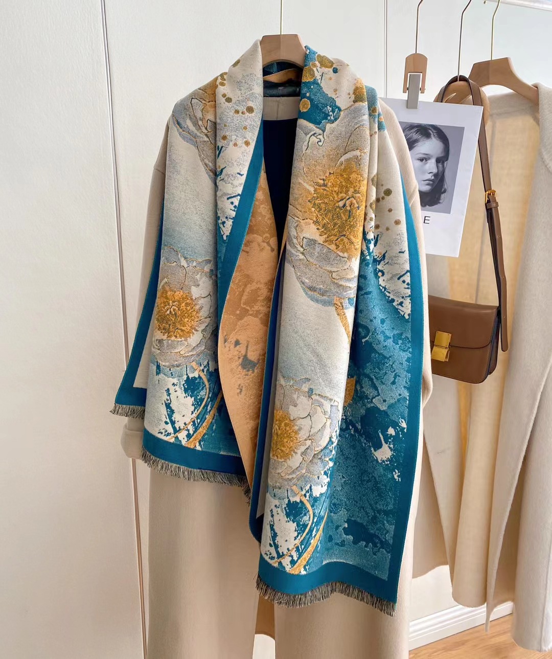 送妈妈优雅围巾秋冬季新款拼色油画保暖加厚羊绒手感女披肩礼物