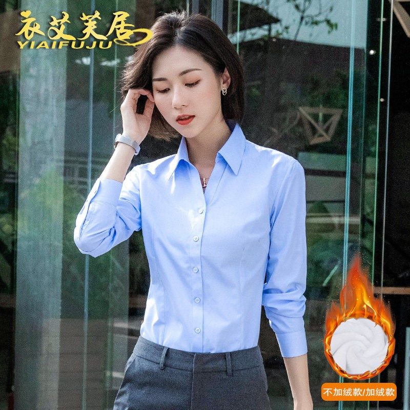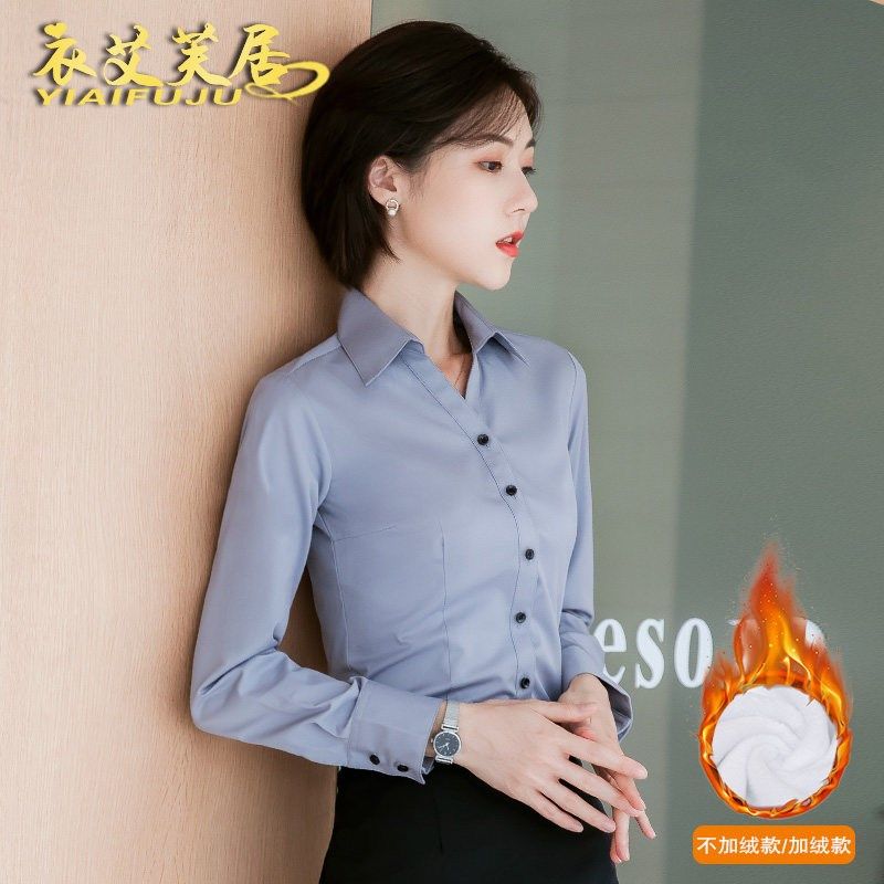 白色衬衫女长袖V领职业正装气质工作服冬新款加绒加厚保暖棉衬衣