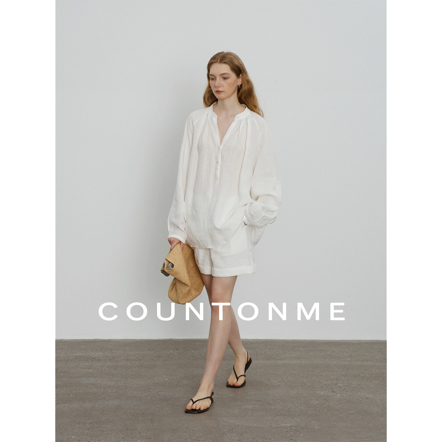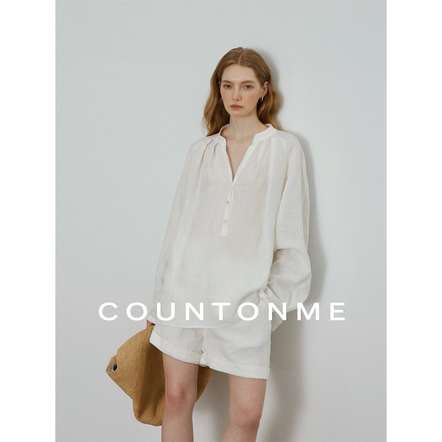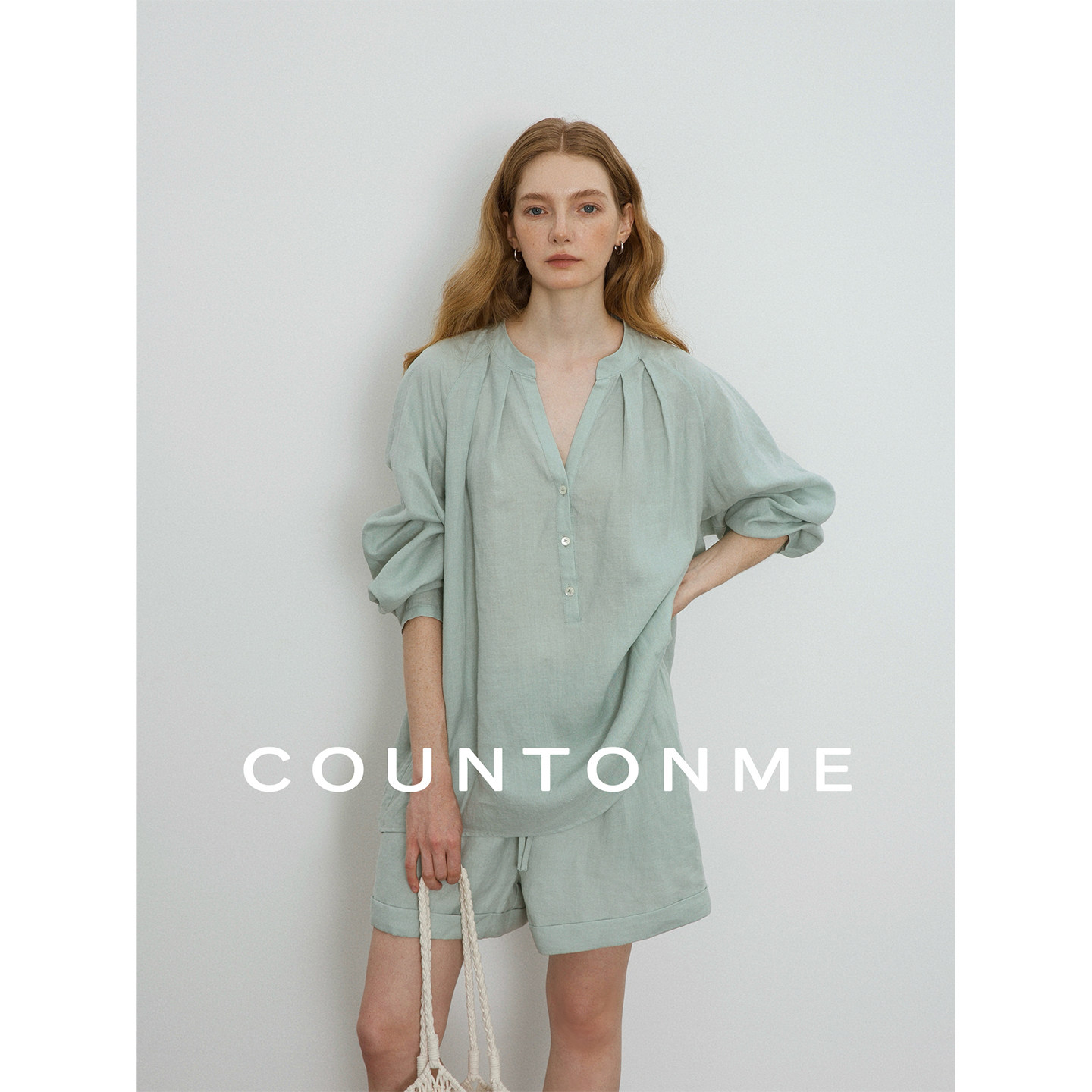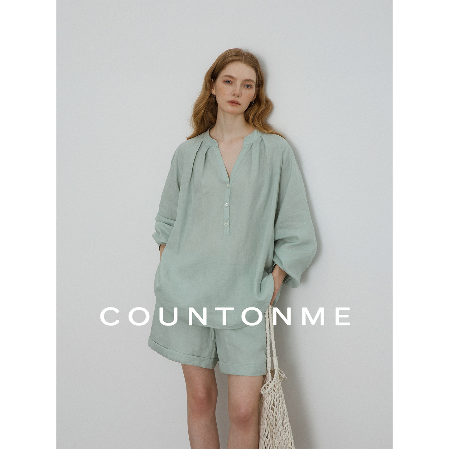 COUNTONME 100天然亚麻V领套头长袖衬衫短裤套装