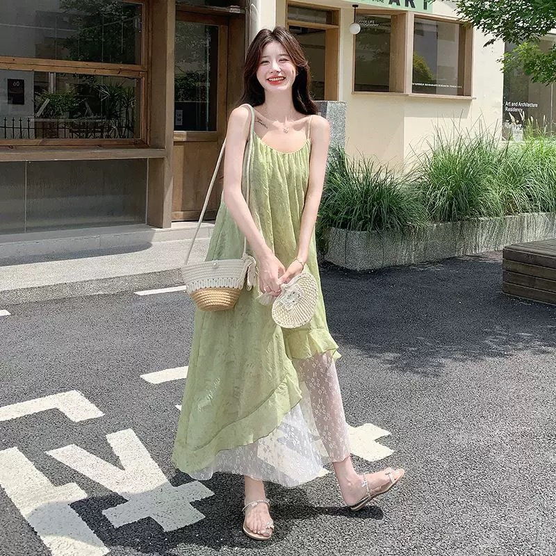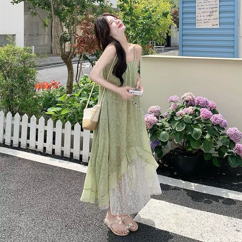 绿色森系碎花吊带连衣裙女夏2025新款法式海边度假雪纺不规则长裙