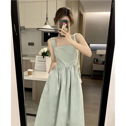 法式方领吊带连衣裙夏季女2026小个子设计感小众收腰显瘦气质裙子