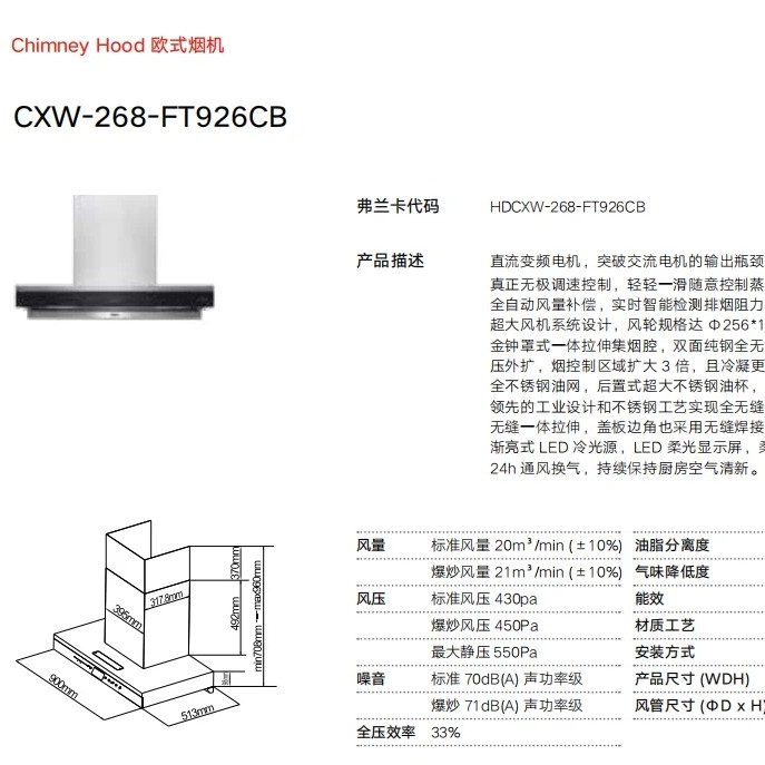瑞士franke弗兰卡家用厨房欧式顶吸抽油烟机脱排大吸力FT926CB