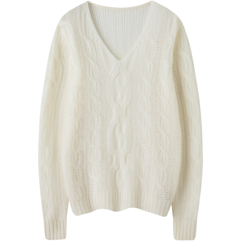 淡烟入梦~V领绞花羊绒衫女宽松慵懒风纯山羊绒毛衣秋冬新款