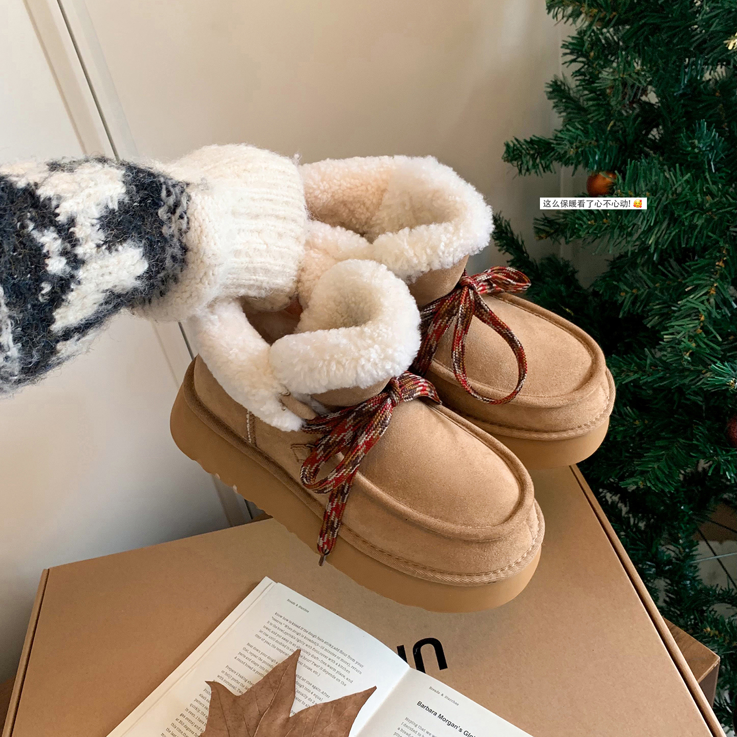 lorem香港 2025冬季时尚圆头短筒系带套脚雪地靴舒适保暖绒面女靴