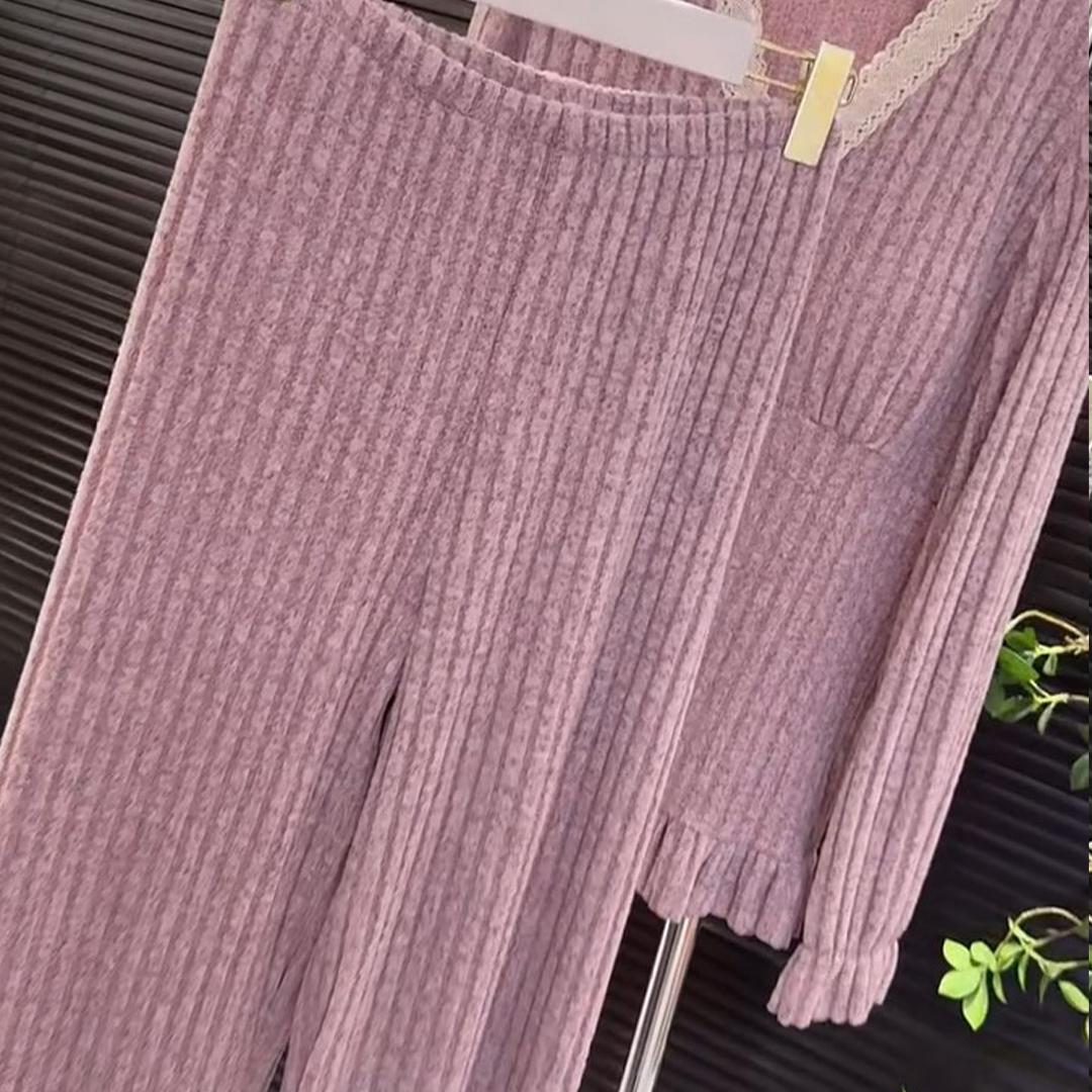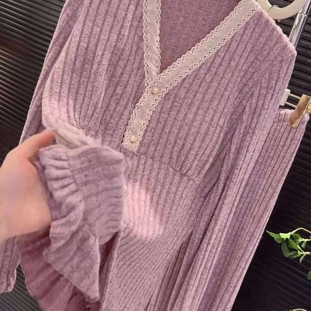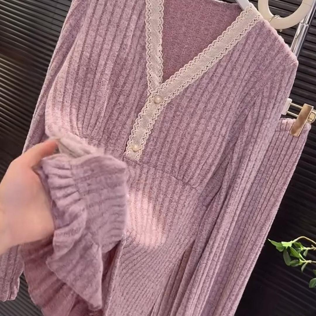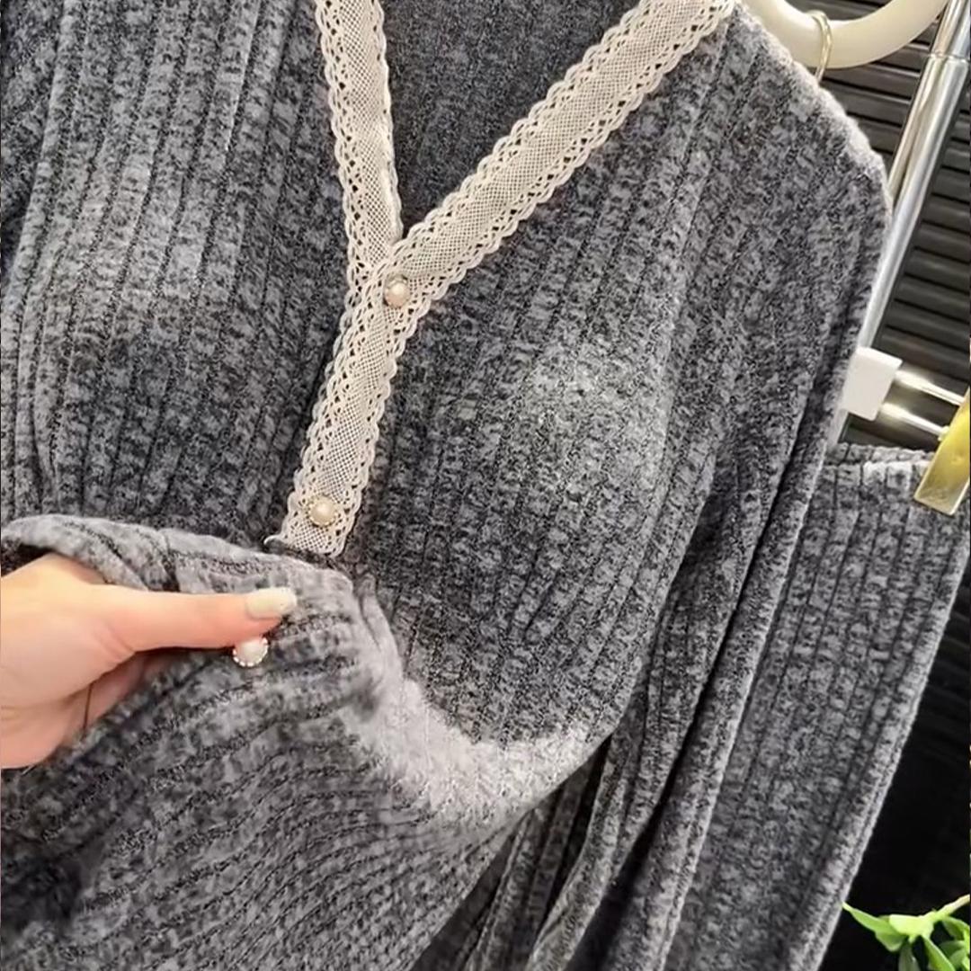 韩版宽松带胸垫加绒睡衣女冬大码显瘦V领气质时尚网红家居服套装