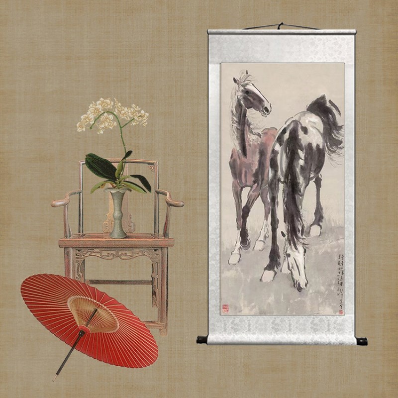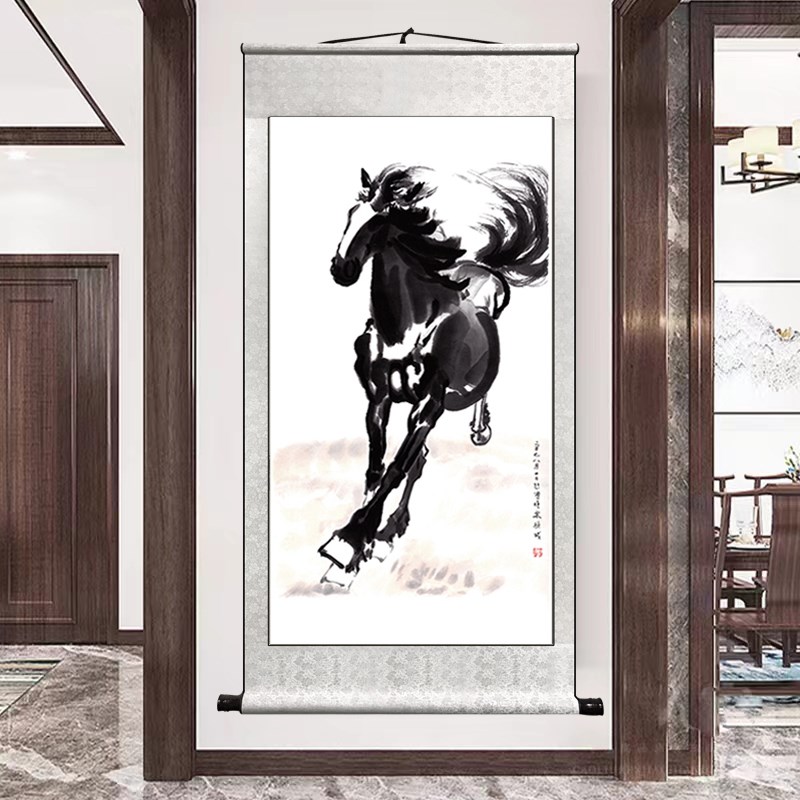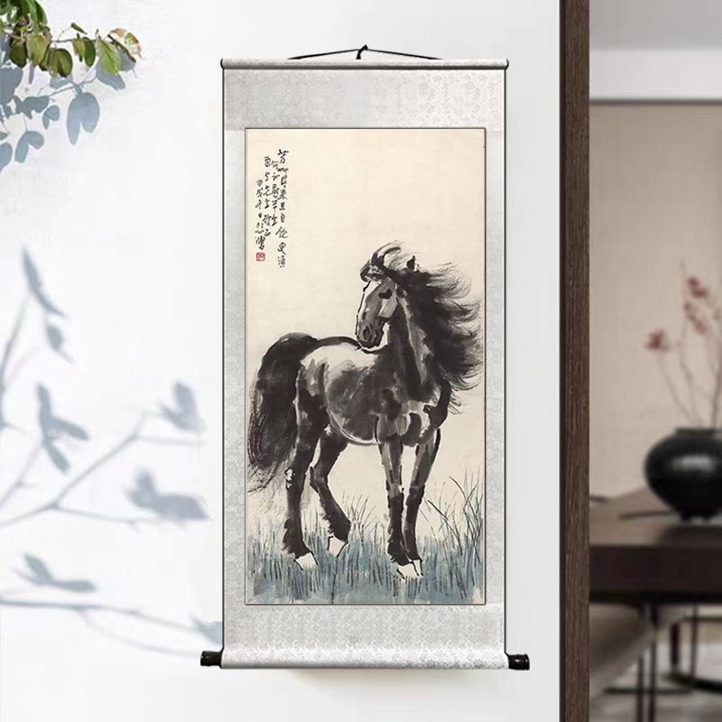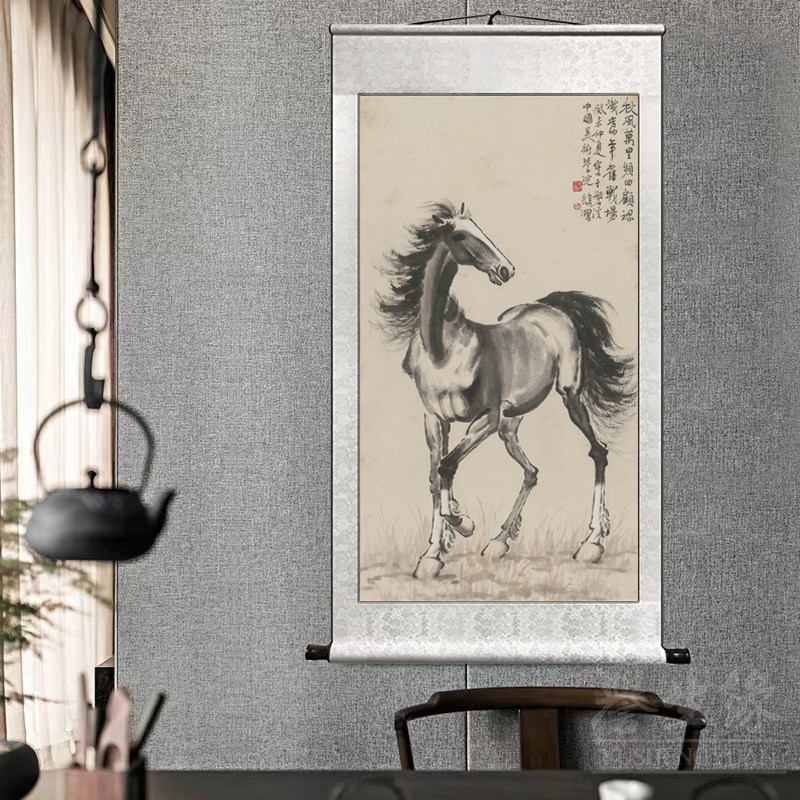 现货速发复古国画徐悲鸿骏马奔马图卷轴挂画客厅玄关办公室装饰画