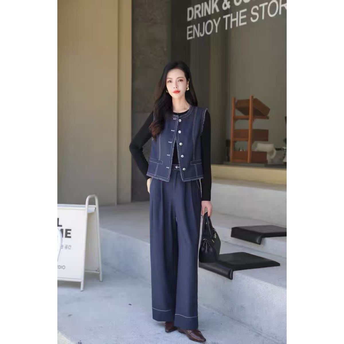 1101 春秋款时尚休闲流苏毛边牛仔马甲打底衫阔腿裤三件套套装MAN