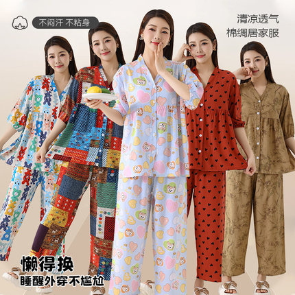 春夏季薄款绵绸睡衣女宽松中袖长裤可外穿大码棉绸开衫家居服套装