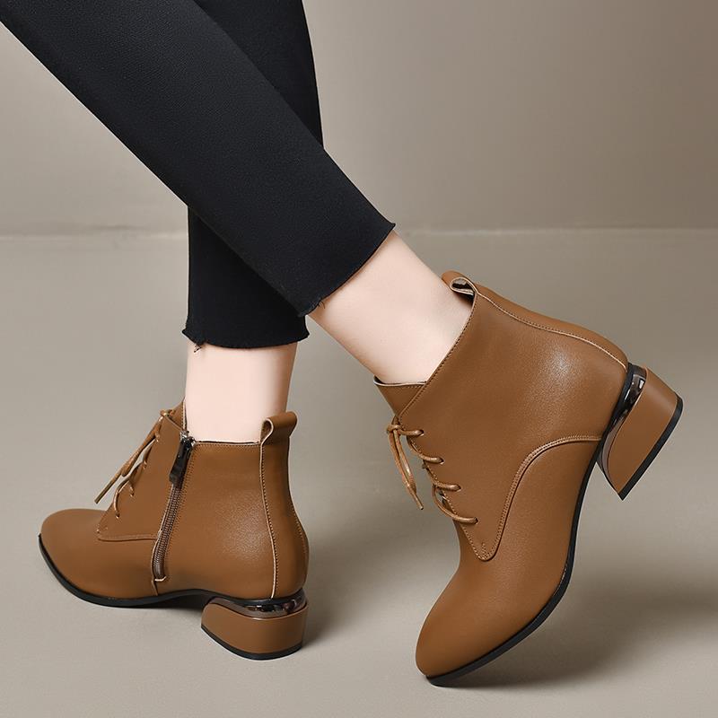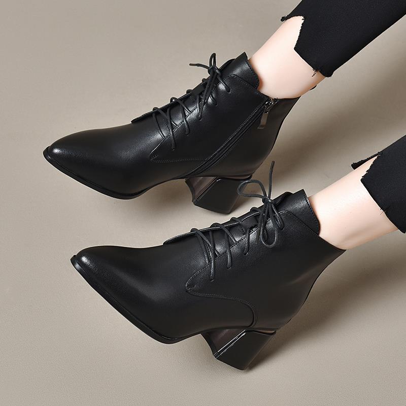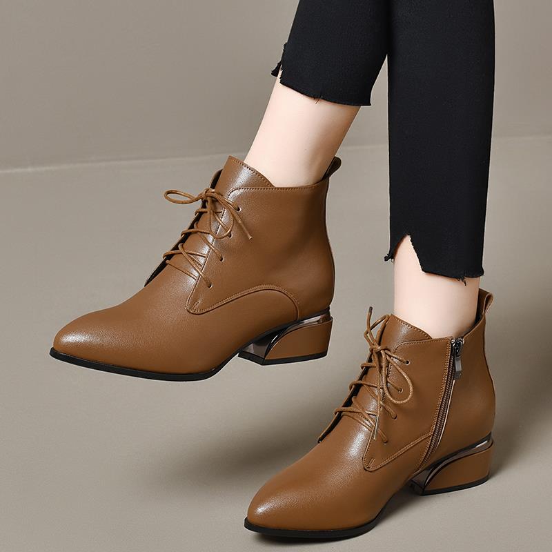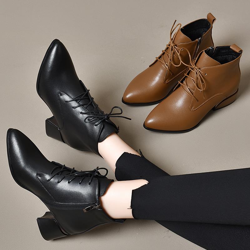 秋冬2025新款季尖头短靴女粗跟中跟系带鞋加绒女鞋高跟马丁1007u