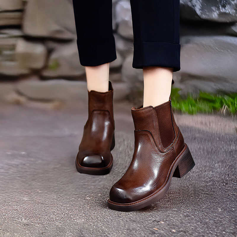四起哥2025秋冬轻奢头层牛皮个性烟筒靴女手工真皮高跟切尔西短靴