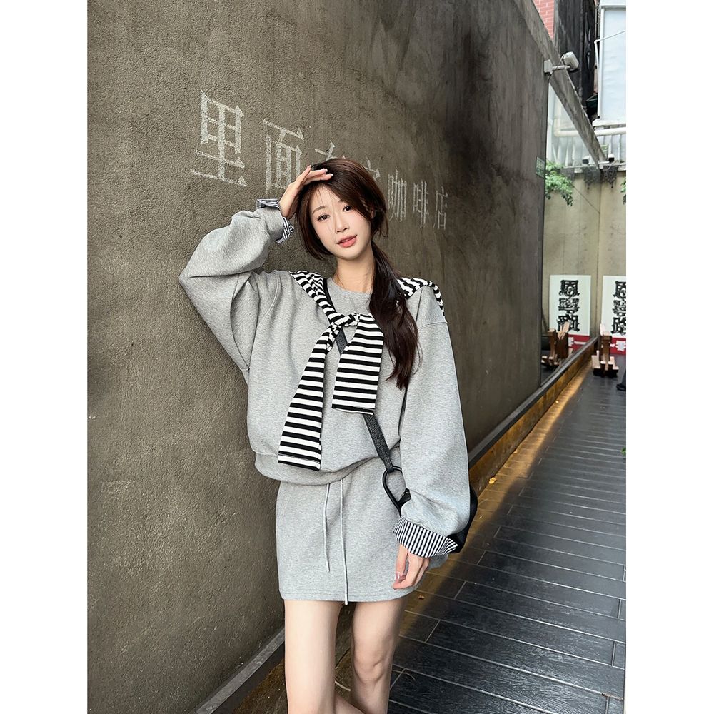 撞色条纹披肩叠穿韩系宽松长袖卫衣高腰抽绳半身裙女早秋两件套潮