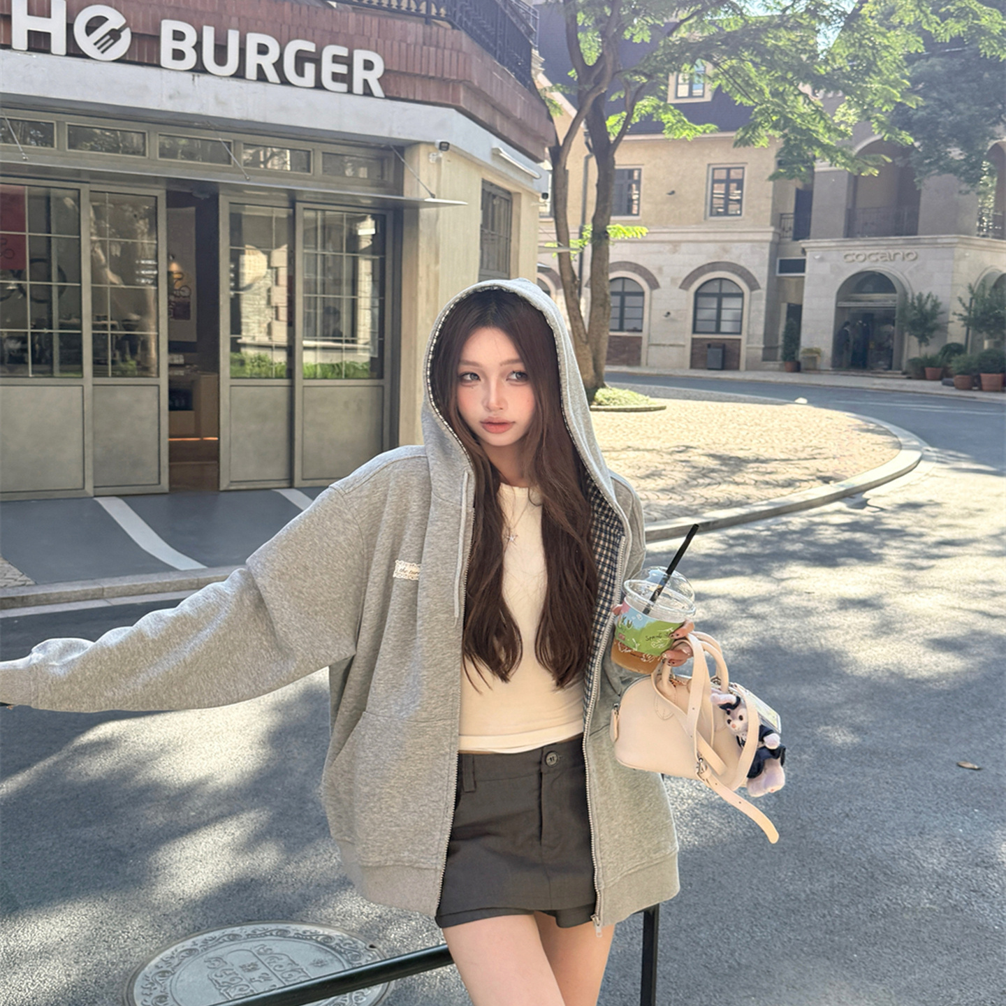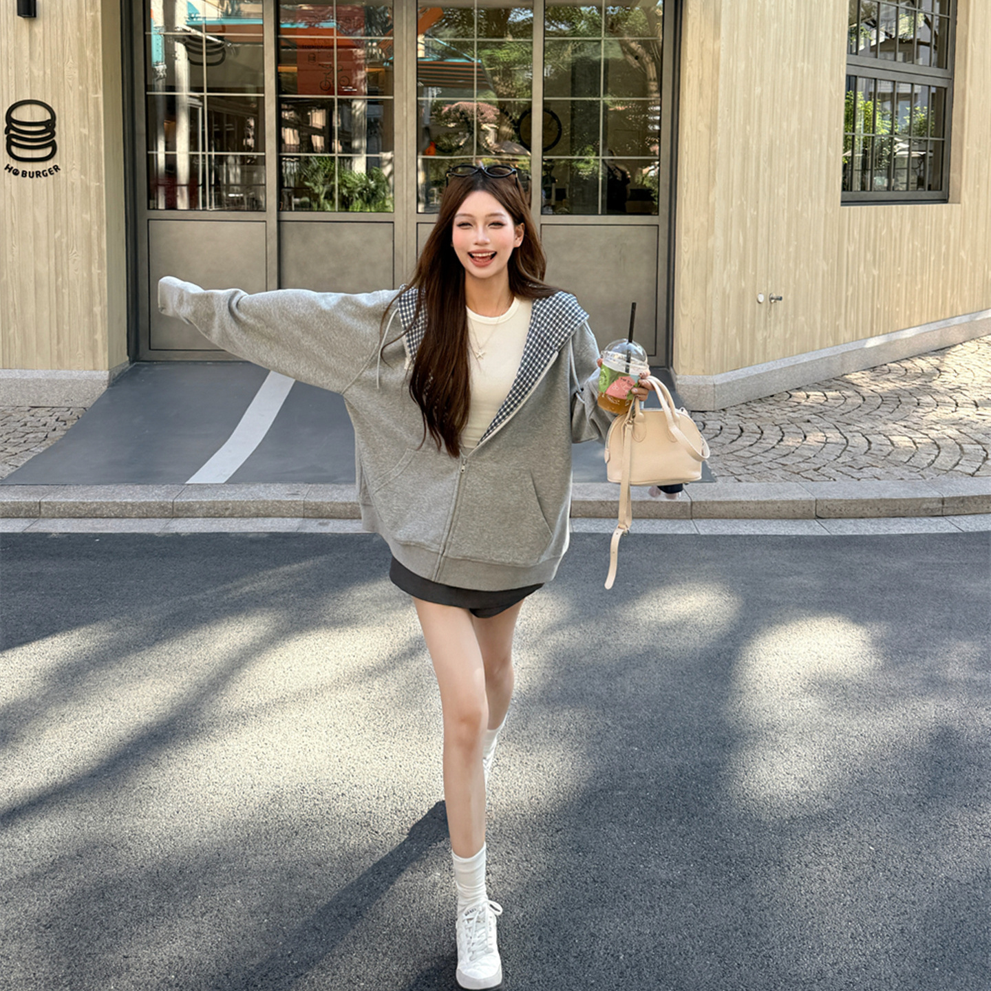 美式撞色拼格大卫衣连帽外套女情侣装宽松慵懒风开衫上衣2025早秋
