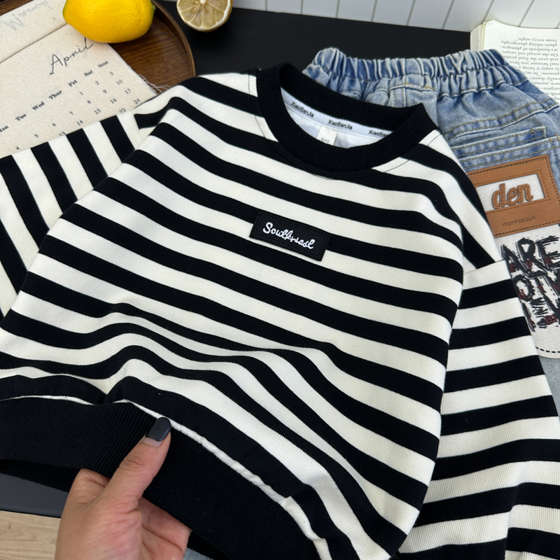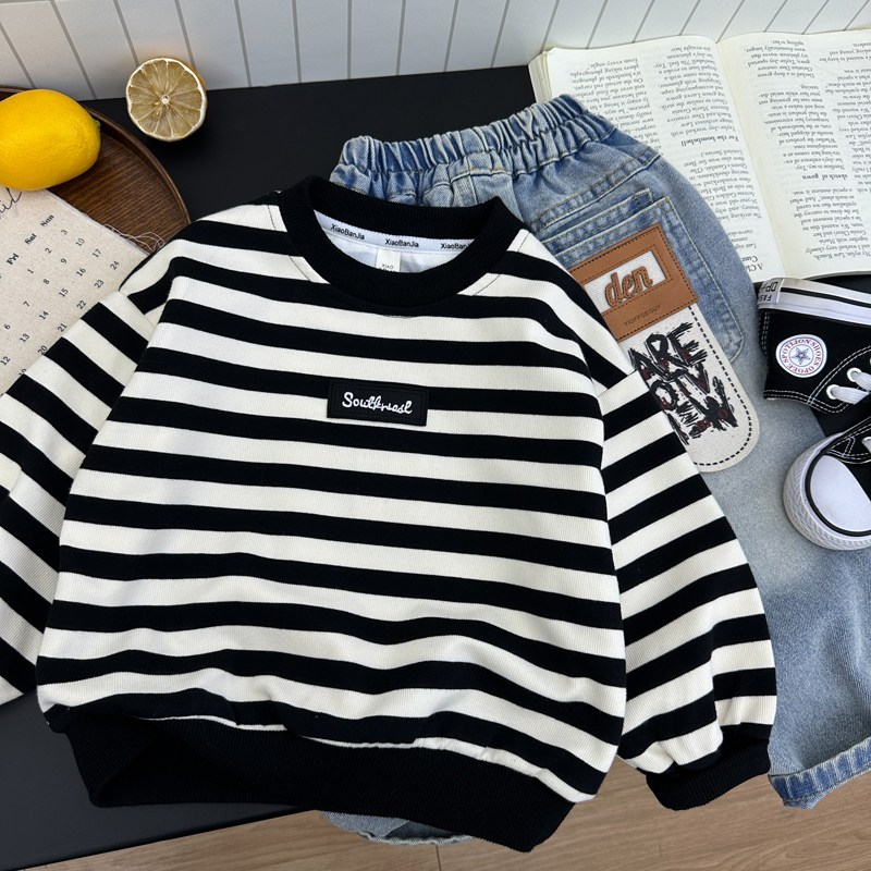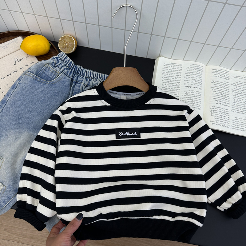 男童秋冬加绒卫衣2025新款儿童条纹一体绒套头衫男孩春秋圆领上衣