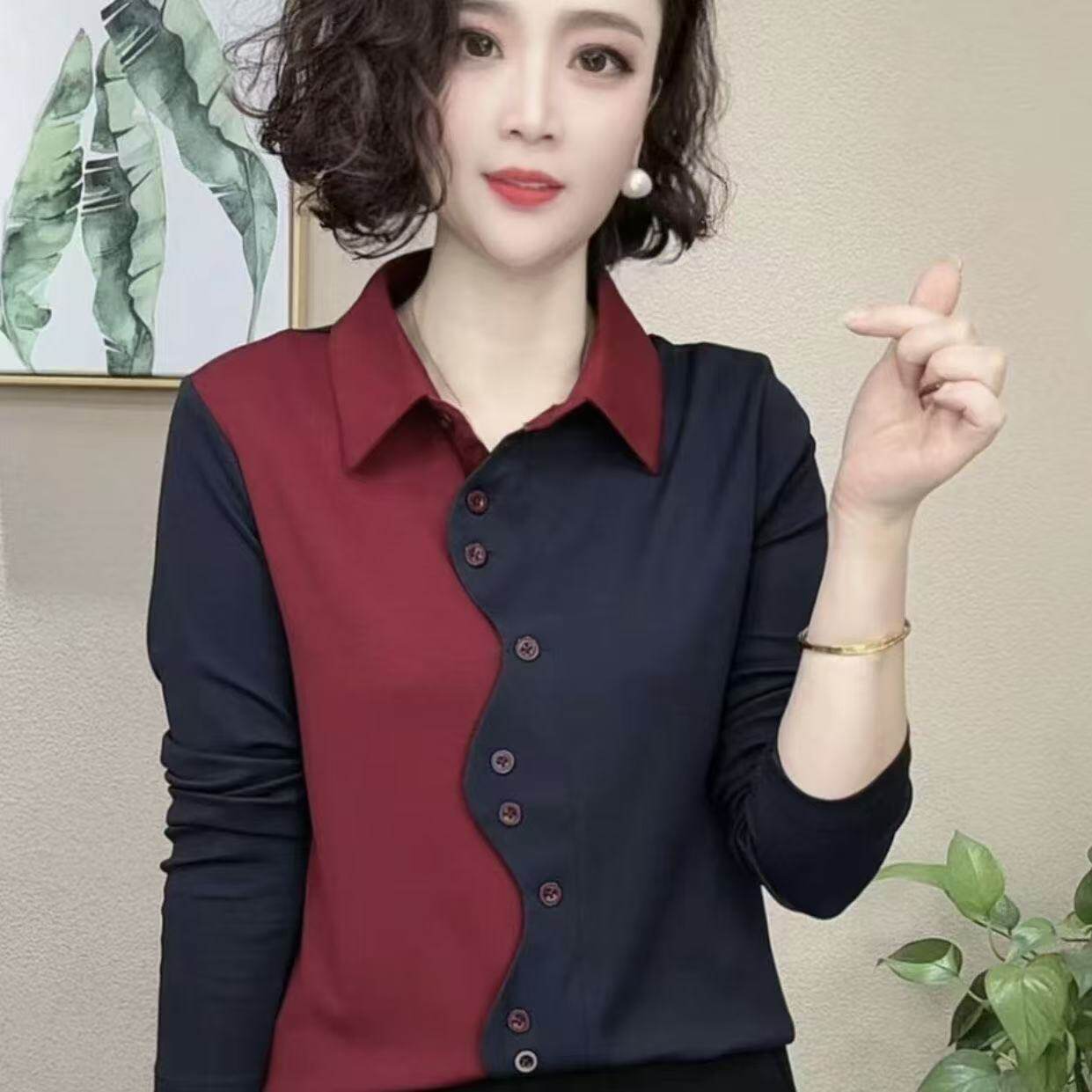 高档新款polo领拼色百搭休闲减龄长袖衬衫气质上衣大码宽松外套