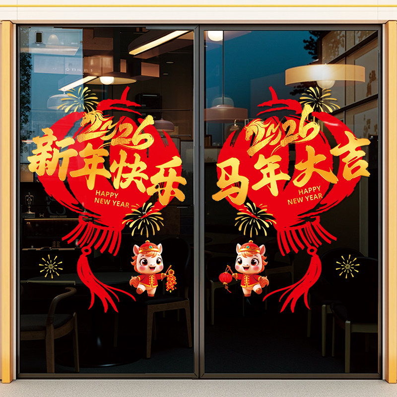 2026年马年静电贴纸中式新年快乐氛围装饰品玻璃门贴商场超市布置