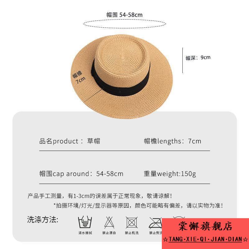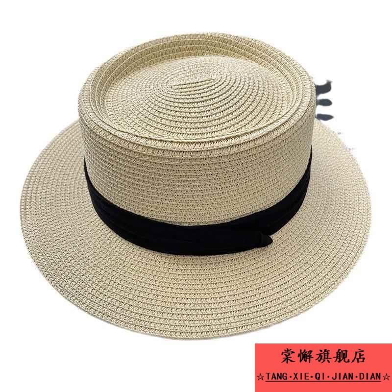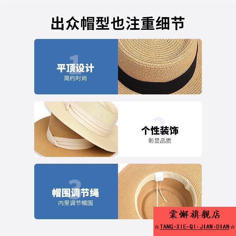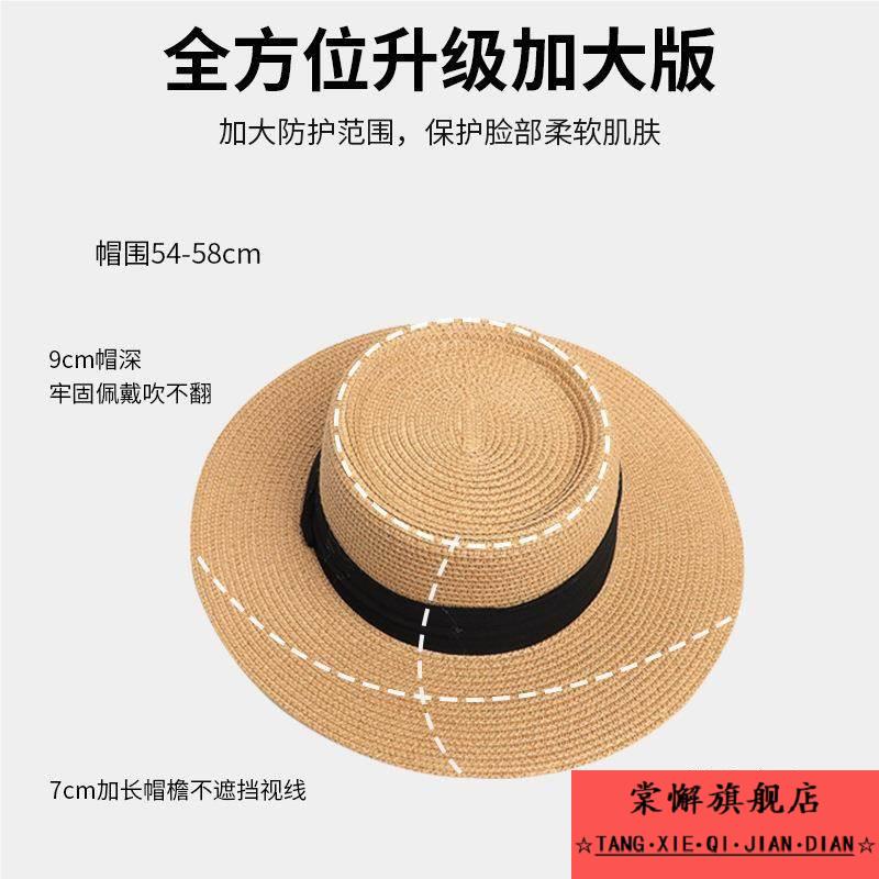 防晒帽子夏季草帽编织女大帽檐遮阳帽英伦平顶礼帽海边度假沙滩帽