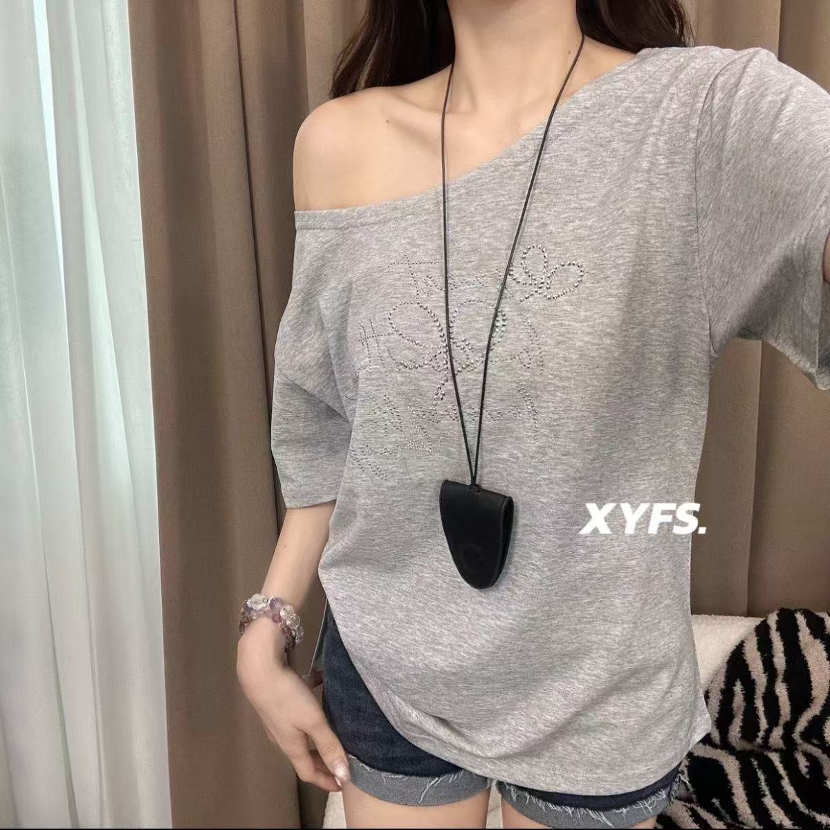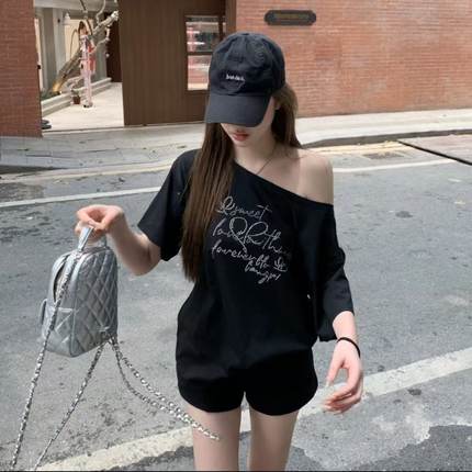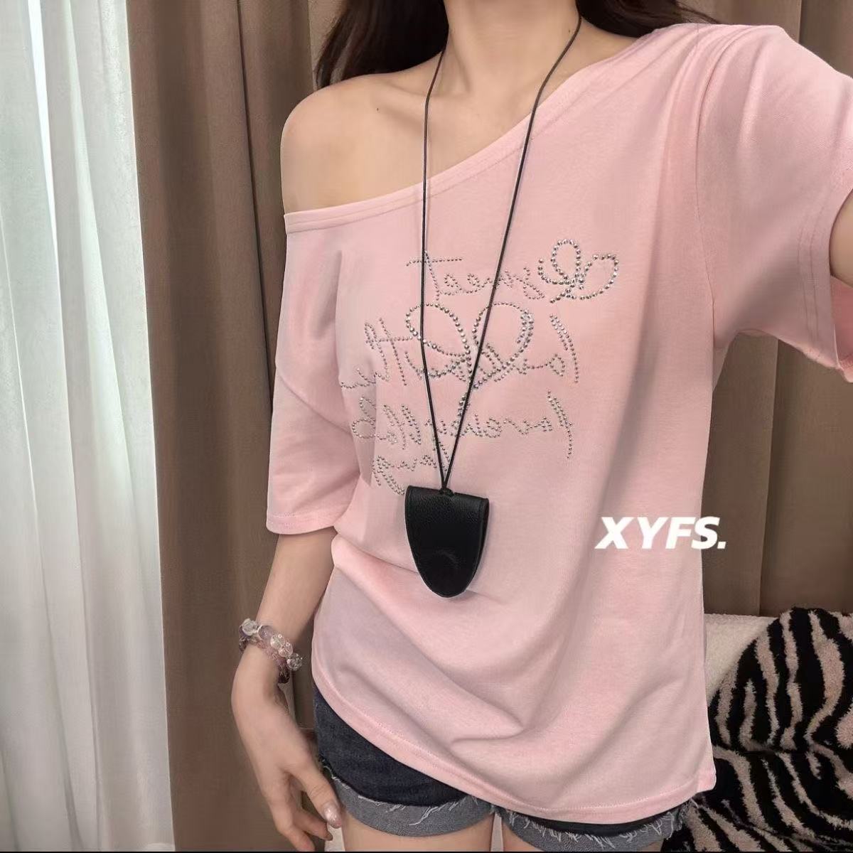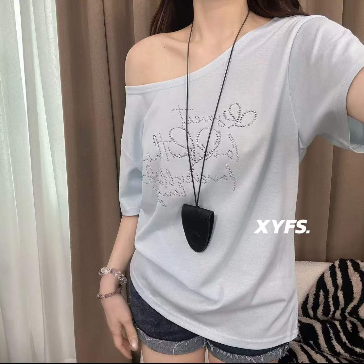 2025夏新款字母烫钻斜肩露肩短袖T恤女上衣宽松显瘦休闲百搭上衣
