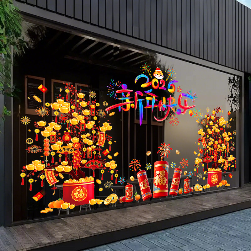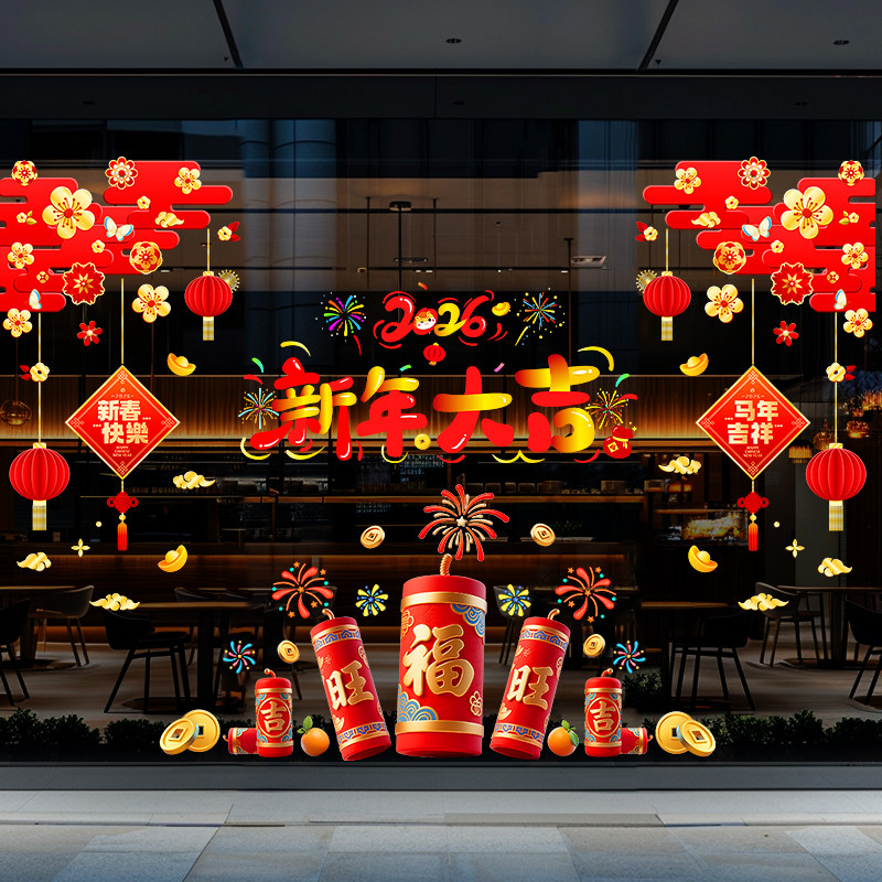 2026元旦马年喜庆玻璃门贴纸过年春节装饰静电贴窗户窗花剪纸布置