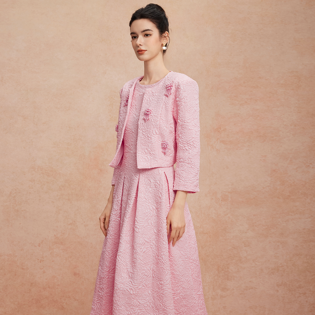 斯尔丽25新款肌理感面料立体钉珠流苏小香风外套配无袖连衣裙套装