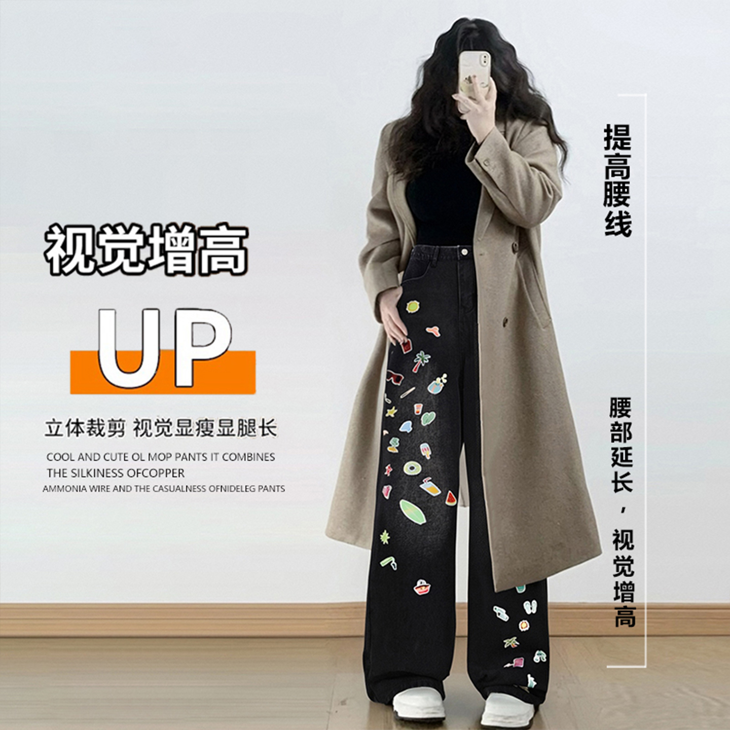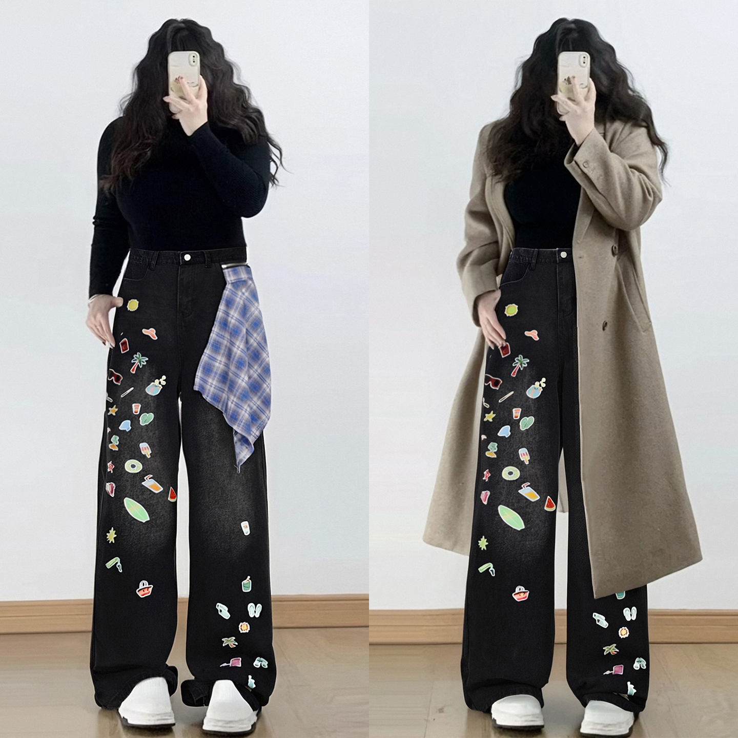 300斤特大码黑色高腰宽松百搭牛仔裤女胖mm卡通印花设计阔腿裤子