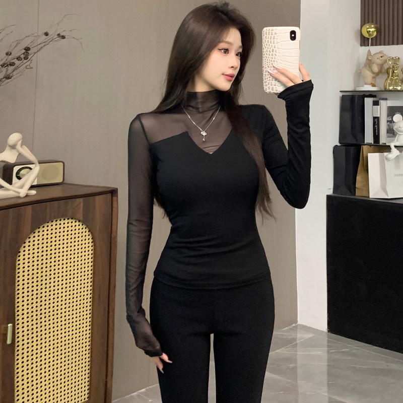 黑色网纱拼接打底衫女秋冬新款辣妹上衣气质内搭修身显瘦长袖t恤