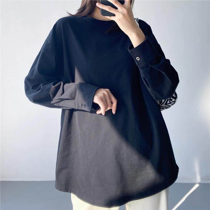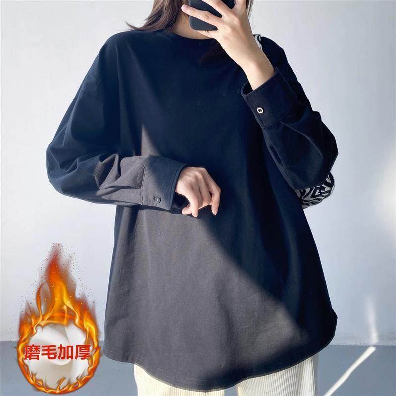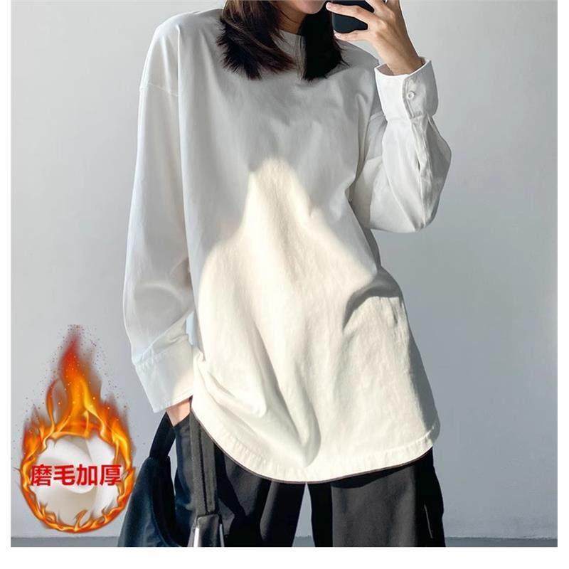 春季白色t恤女秋冬中长款衬衫袖叠穿内搭打底衫加绒加厚圆领0116h