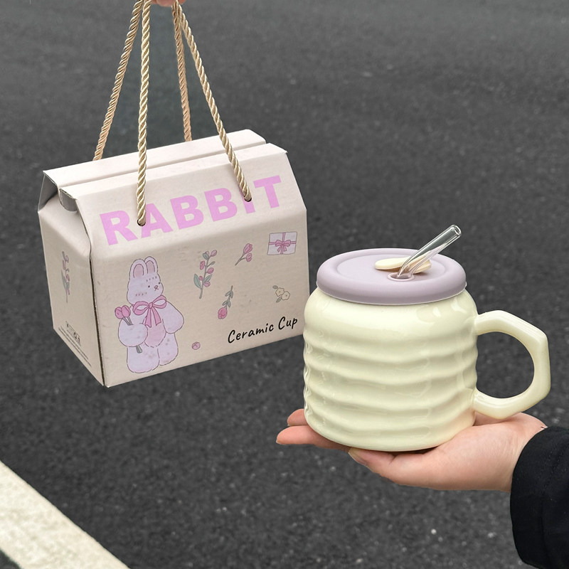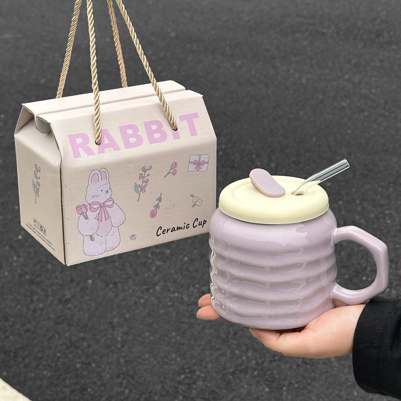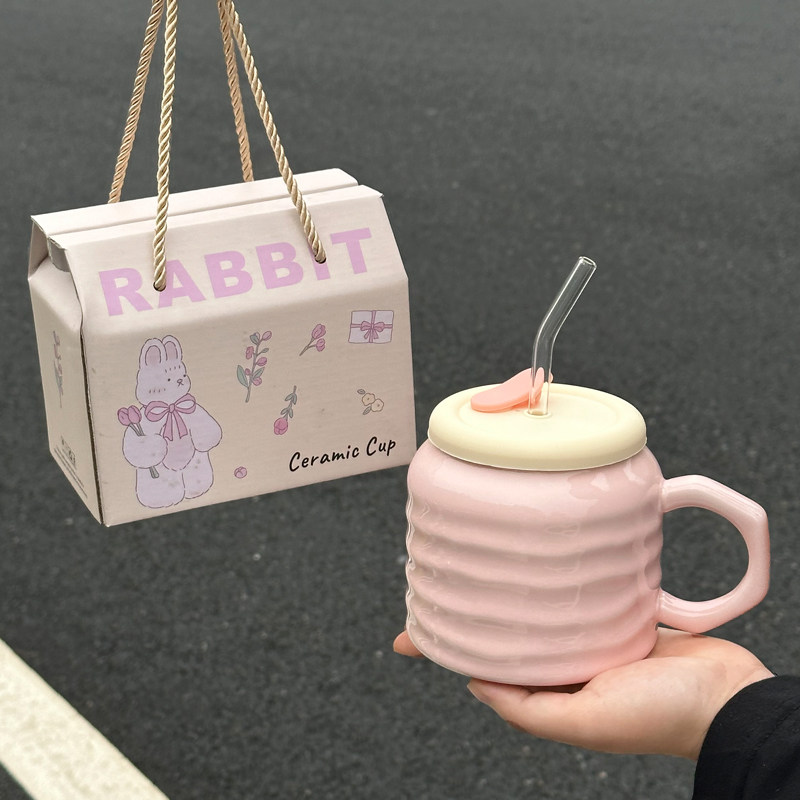 ins芋泥啵啵吸管杯女生大容量陶瓷马克杯带盖办公室简约咖啡杯子