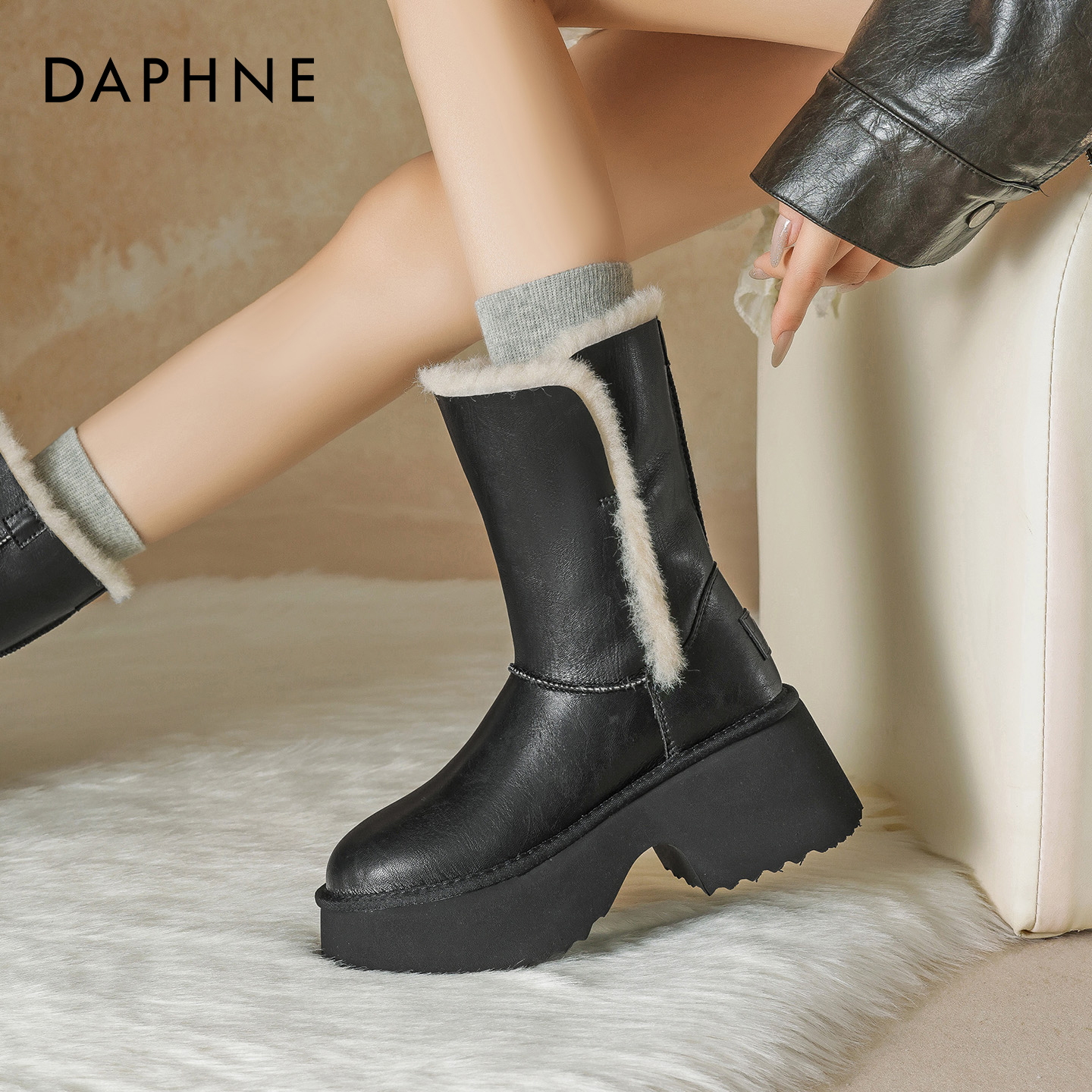 达芙妮加绒雪地靴女2025新款冬季高跟保暖防滑东北棉鞋可翻折短靴