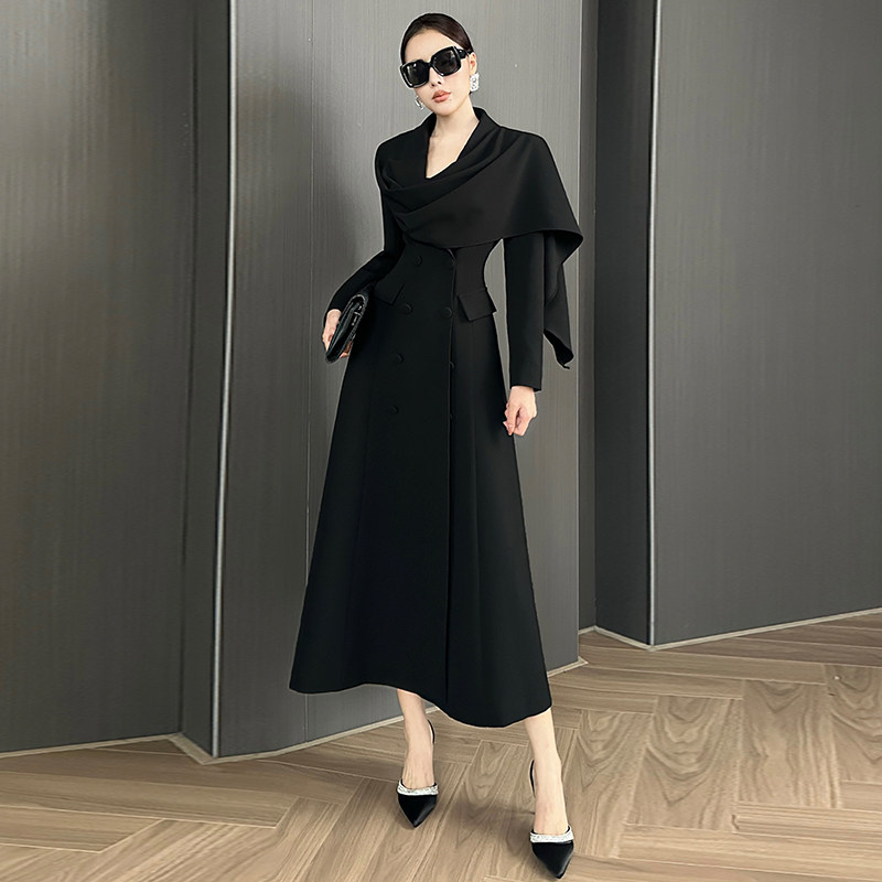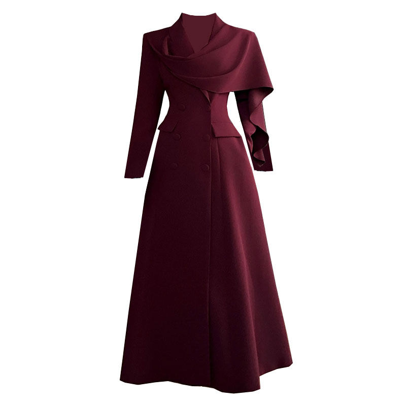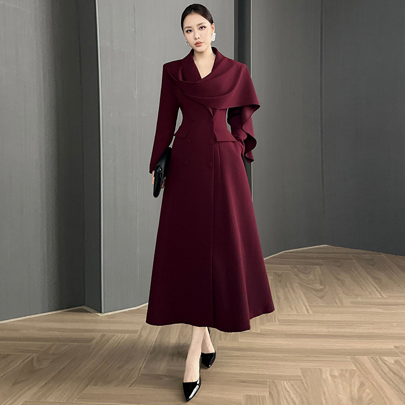 时尚荡领长袖双排扣气质显瘦修身大摆保暖长款风衣外套女秋冬新款