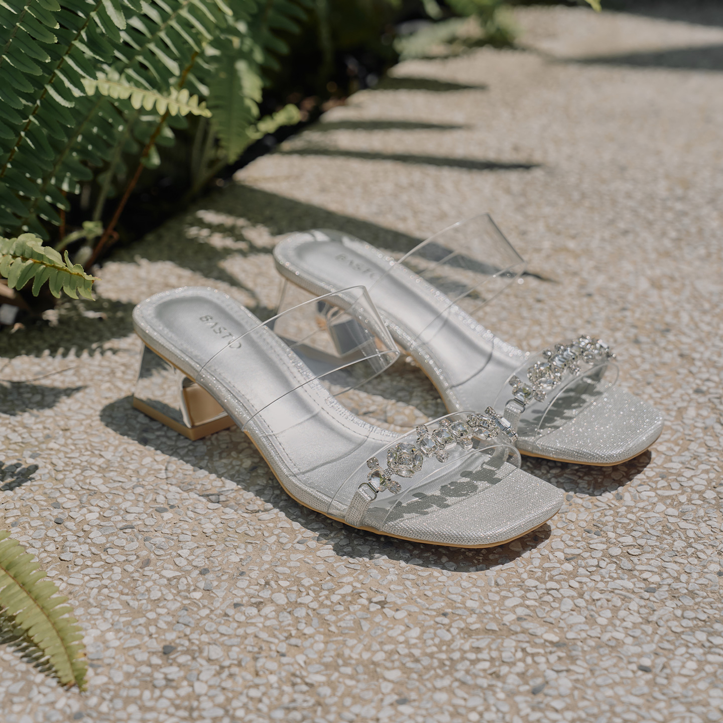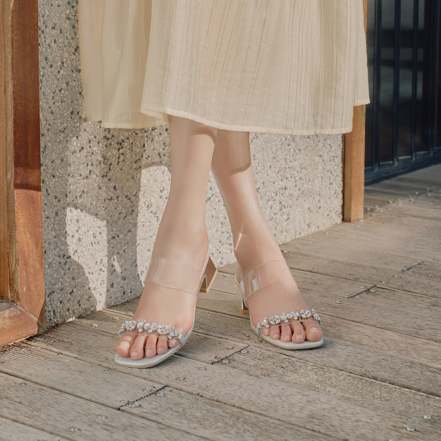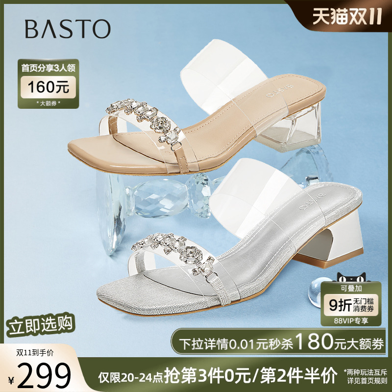 百思图2025夏商场新款仙女风透明跟一字拖粗跟外穿女拖鞋TNE45BT5