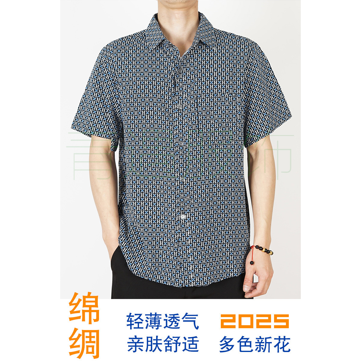 凉爽中老年男装夏季装绵绸短袖花衬衫棉绸中年男士翻领爸爸上衣