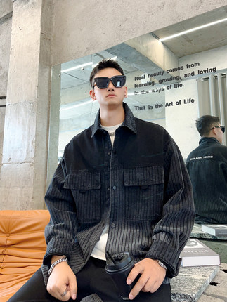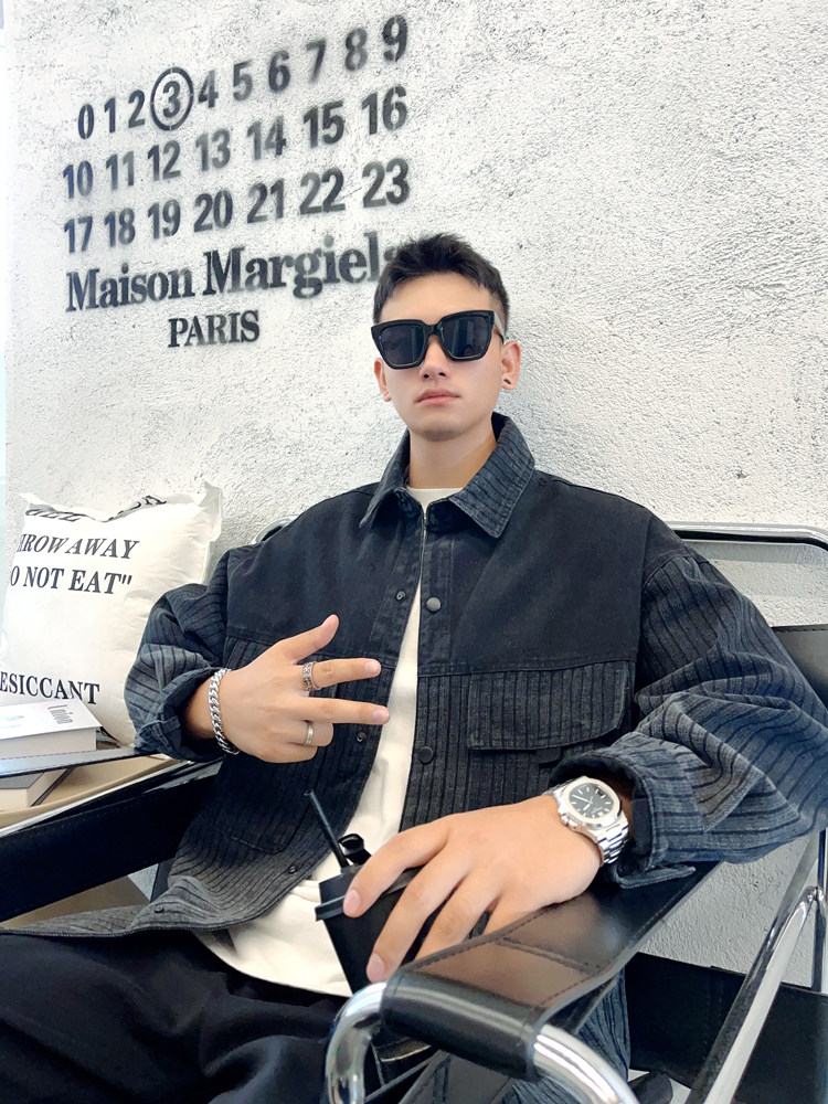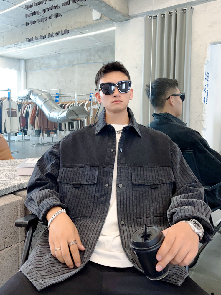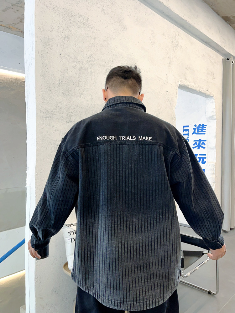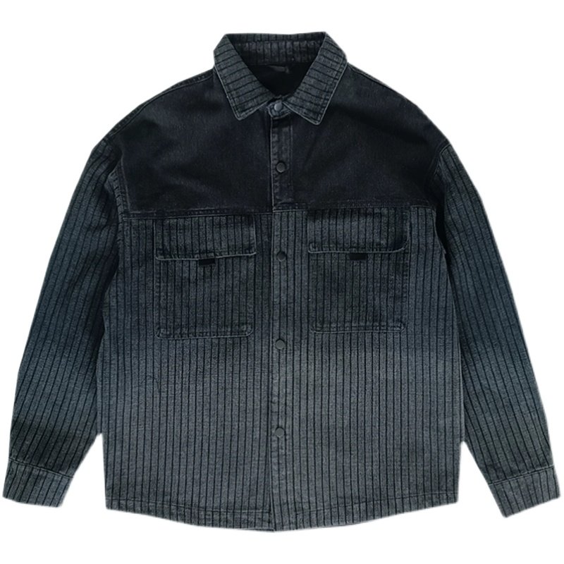 牛仔服外套男士潮牌翻领渐变色条纹上衣青年春季新款宽松休闲夹克