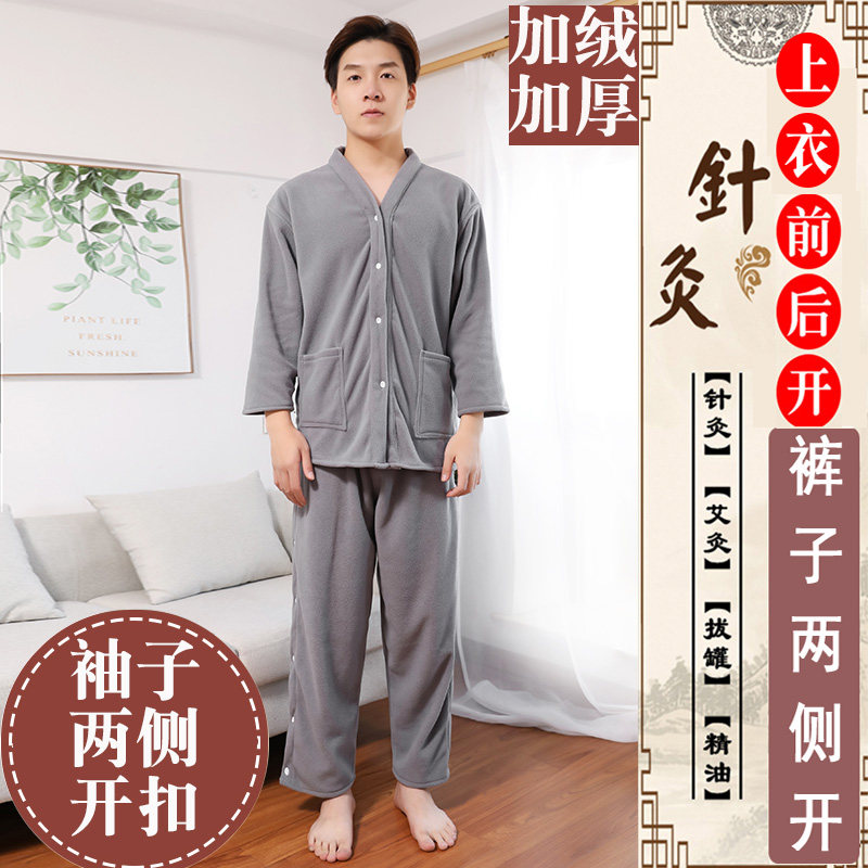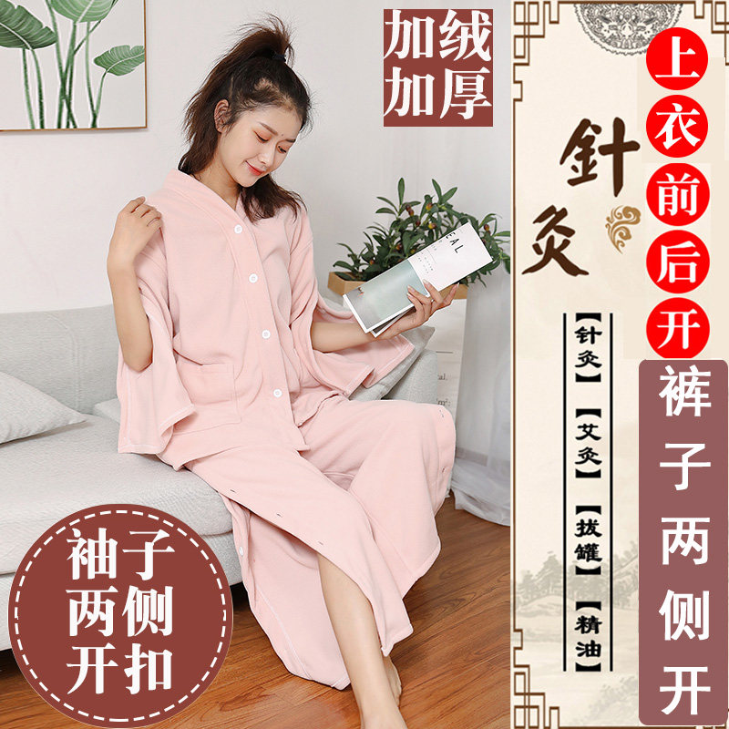 秋冬加厚加绒袖子开扣艾灸服纯棉前后开衫长款理疗服针灸按摩拔罐