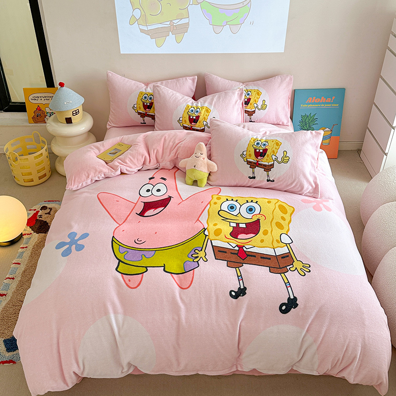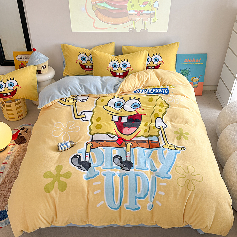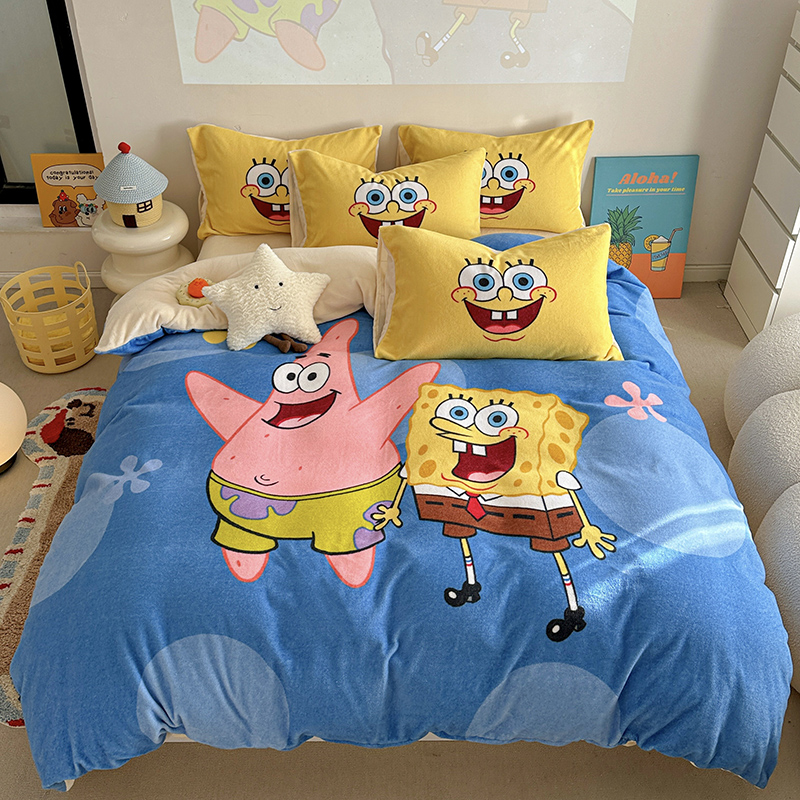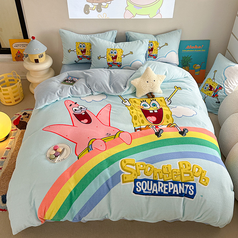 海绵宝宝冬季牛奶绒床上四件套2024新款珊瑚被套床品单儿童三件套