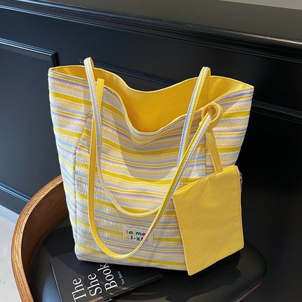 夏季条纹双面帆布包包女大容量旅行手提袋百搭单肩学生通勤托特包