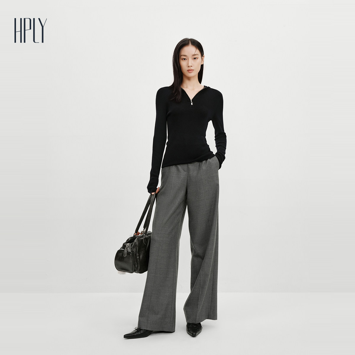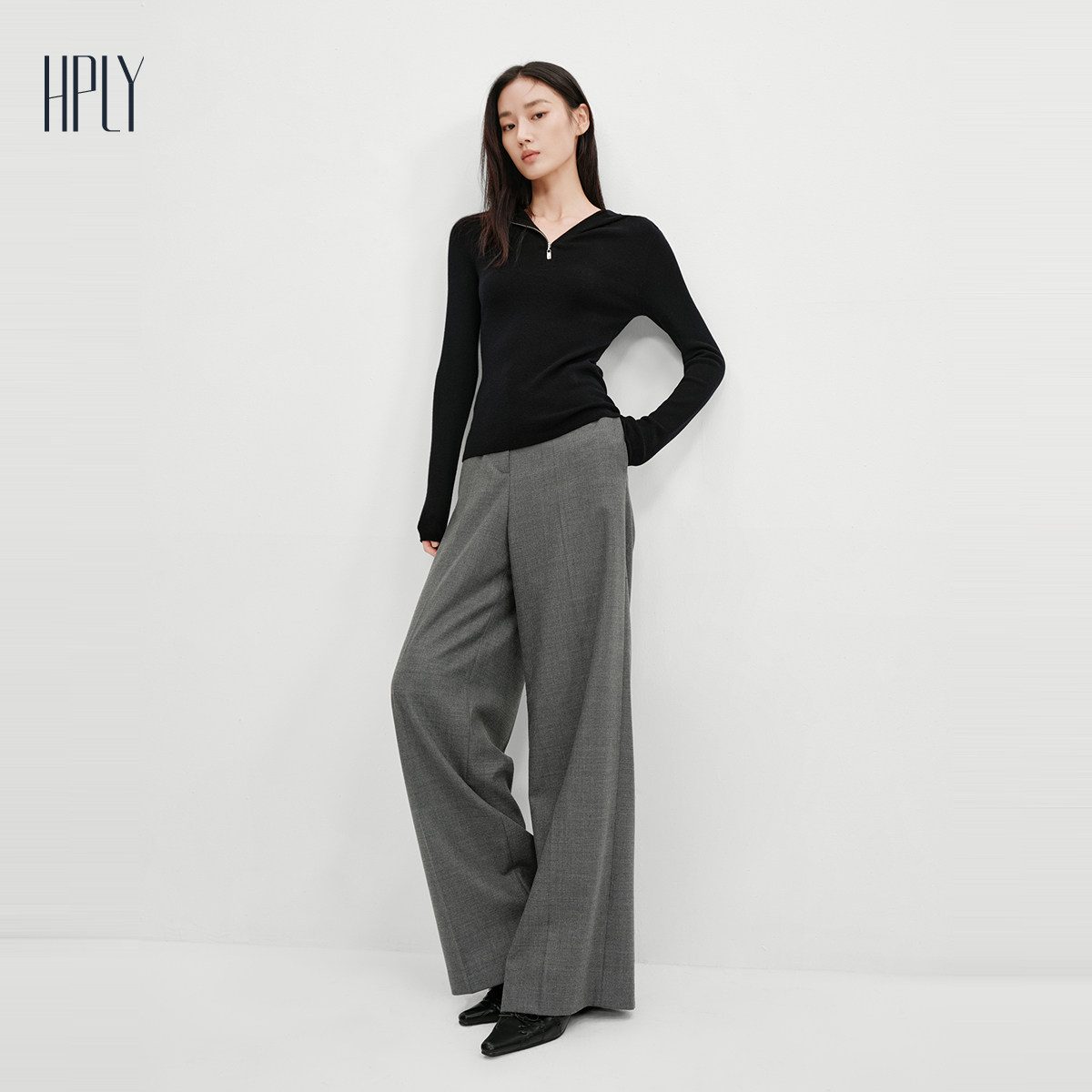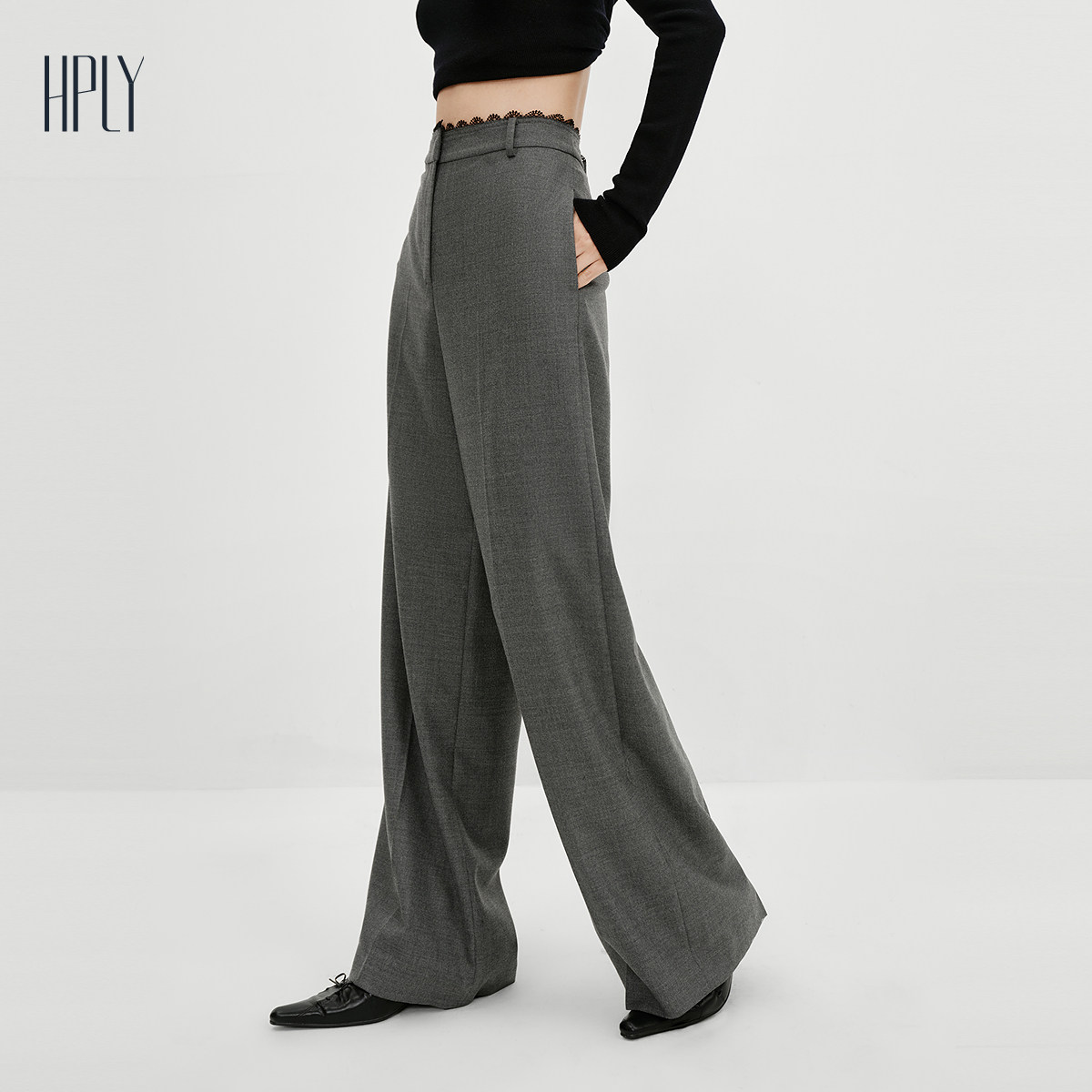 【商场同款】HPLY荷比俪2025冬新款绵羊毛腰头蕾丝拼接西装休闲裤